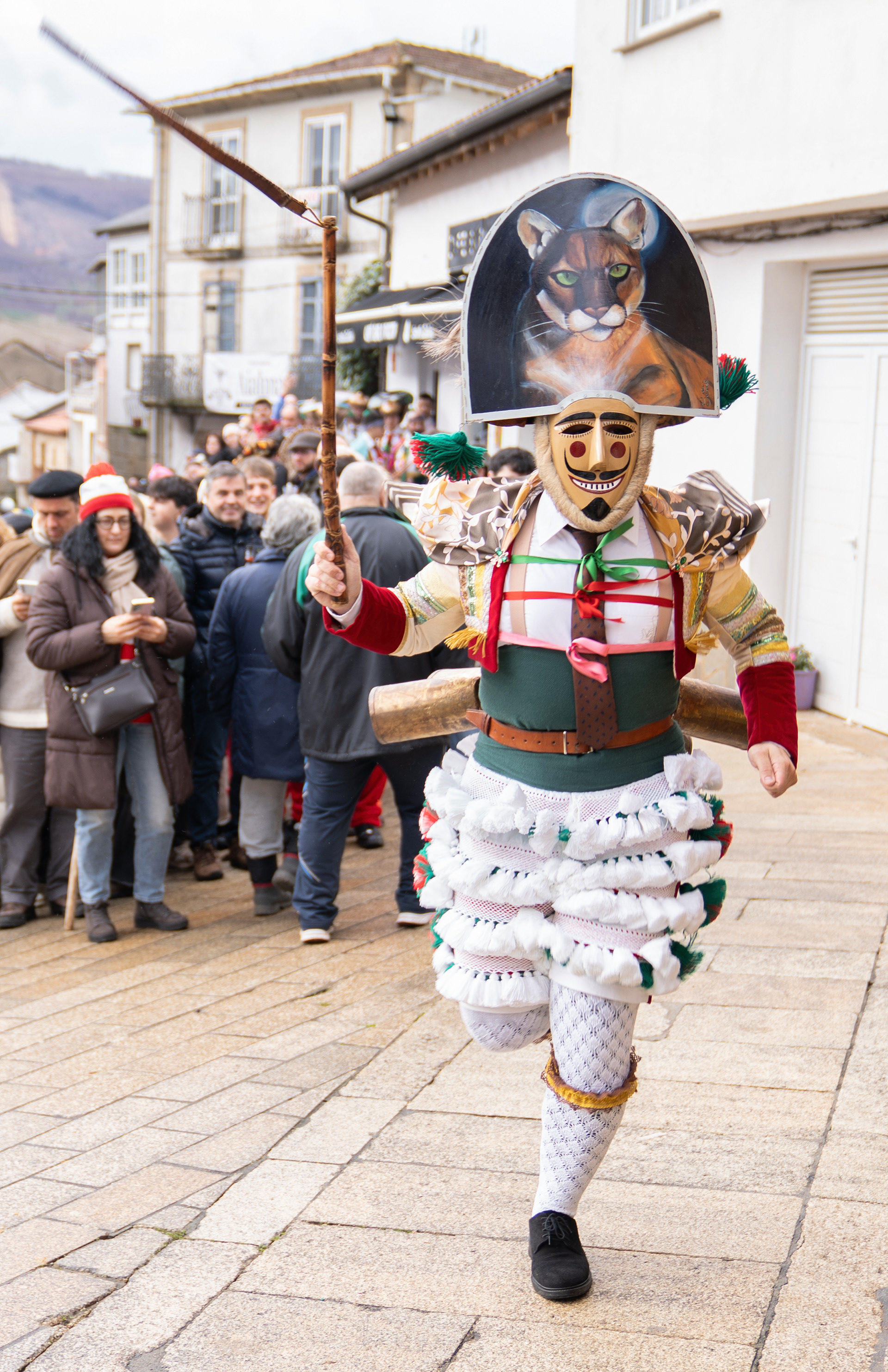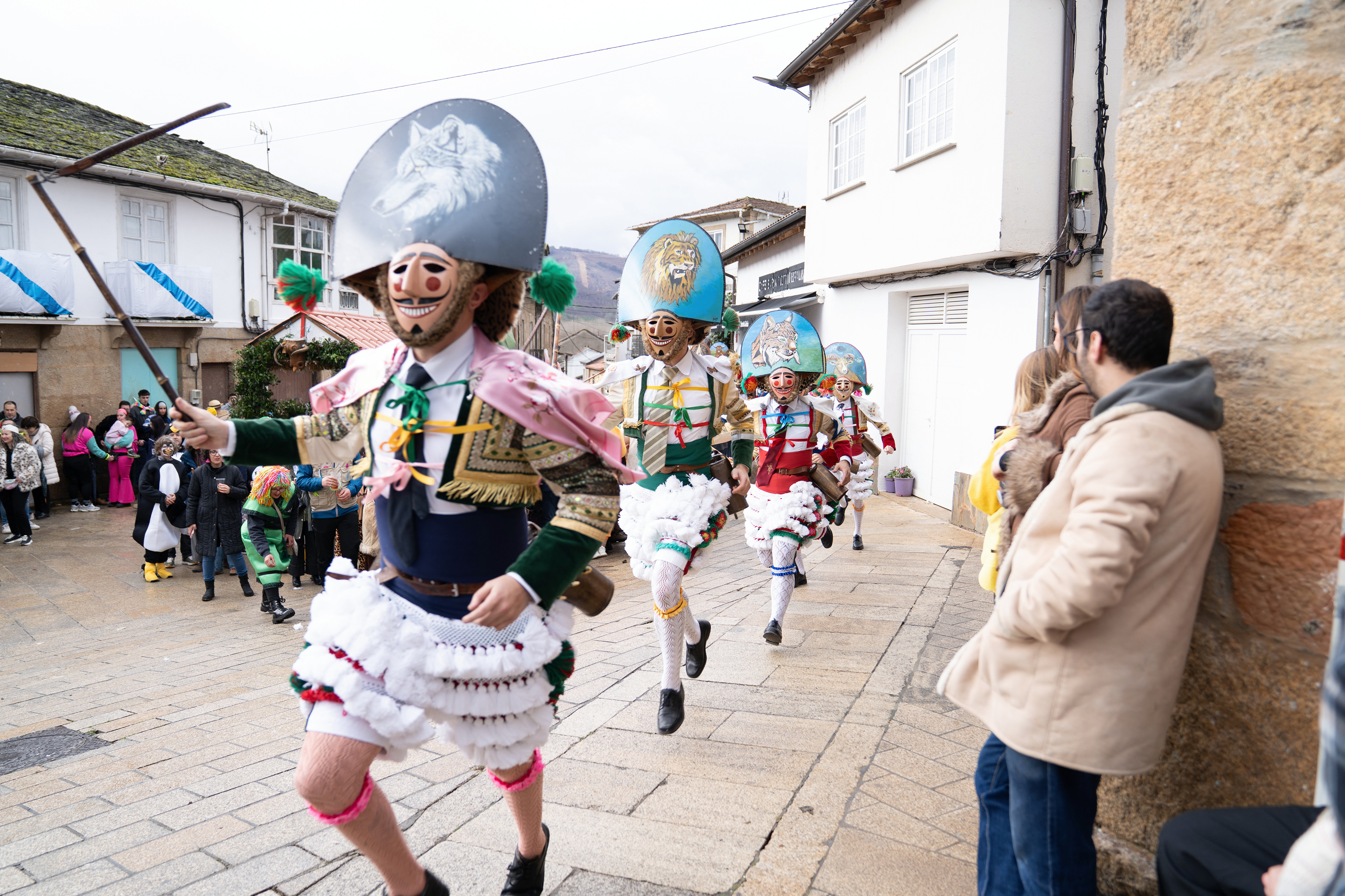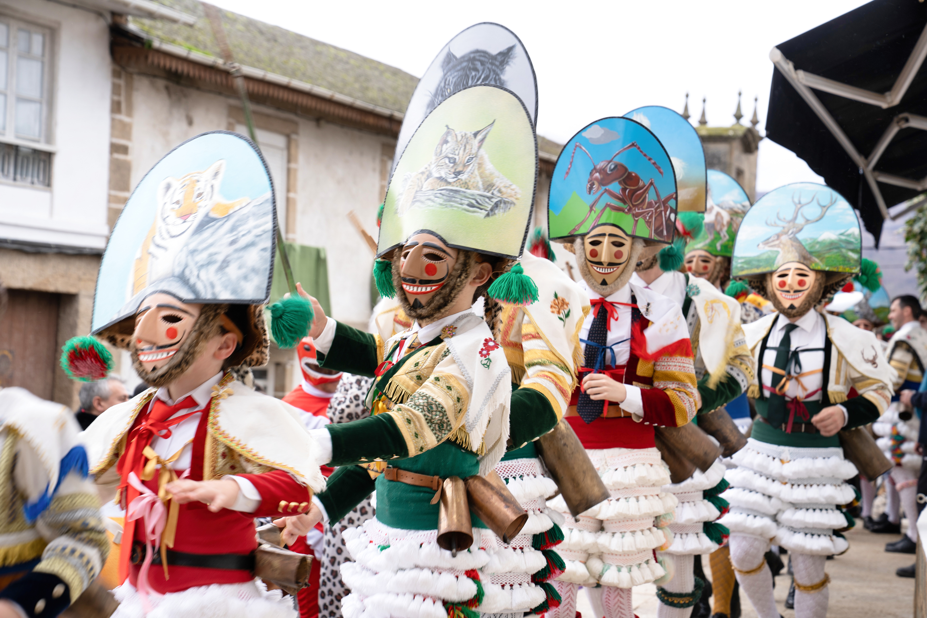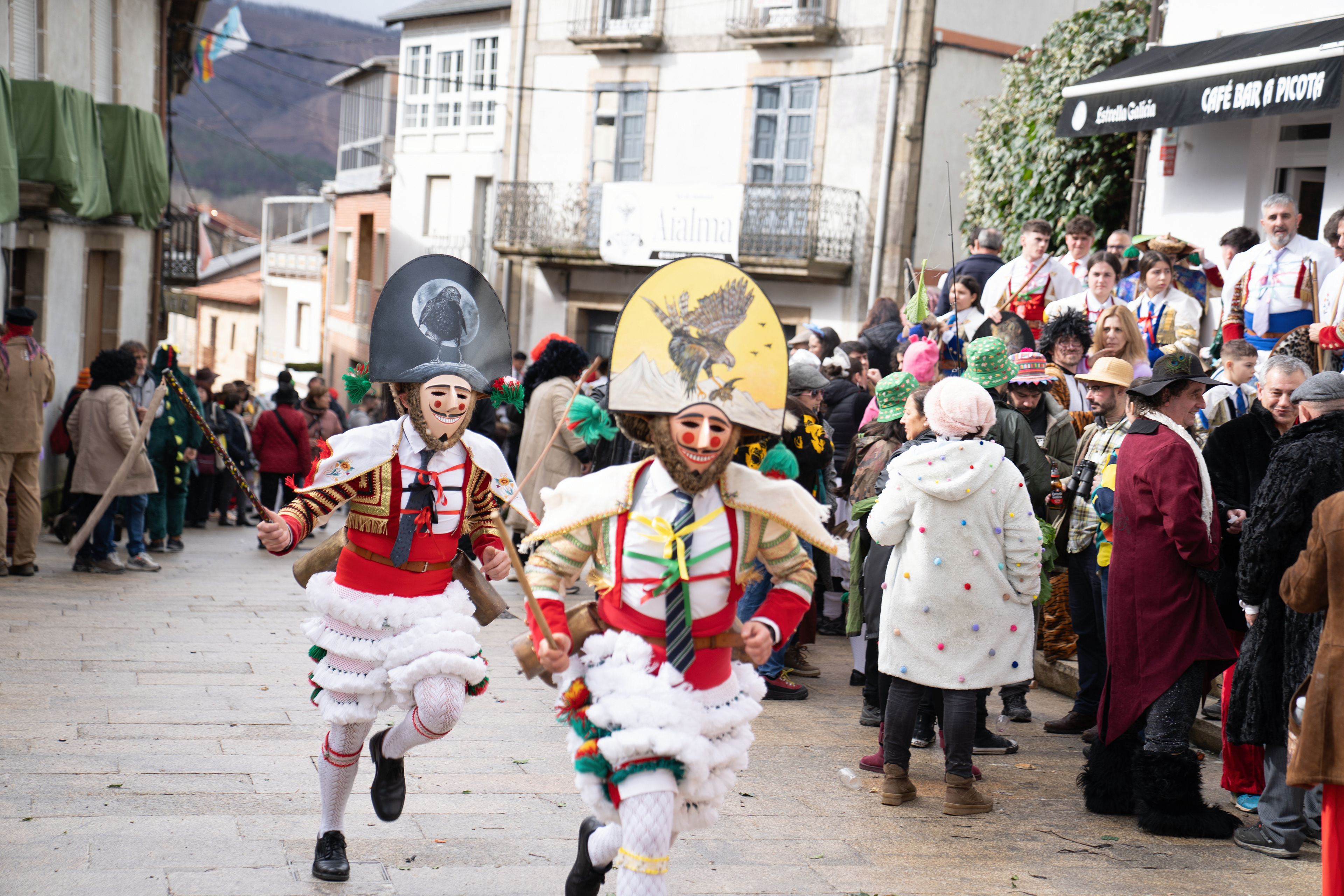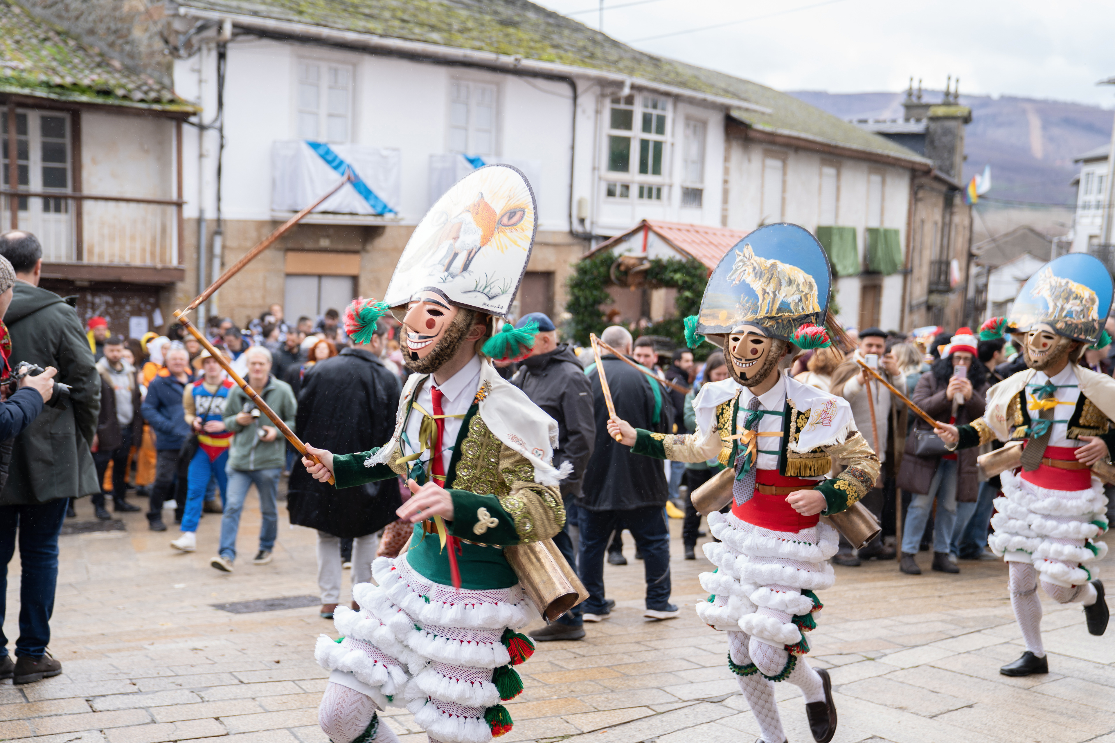 Los Felos de Maceda Aunque a menudo se confunden con los Peliqueiros de Laza o los Cigarróns de Verín, los Felos de Maceda tienen una identidad propia y un carácter distintivo: La Vestimenta: Lucen una careta de madera tallada con una sonrisa burlona y una mitra de cartón decorada con motivos de la fauna local (habitualmente aves o lobos). Visten camisas blancas, corbata, una chaqueta corta con flecos y medias de lana negra. El Sonido: Lo más característico son las chocas (encerros) colgadas de un cinturón de cuero, que anuncian su llegada con un estruendo rítmico mientras corren o saltan. El Comportamiento: El Felo es una figura de autoridad absoluta. Tiene permiso para asustar, saltar sobre la gente y usar su látigo (zamarra), pero no se le puede tocar. Su origen se asocia a antiguos recaudadores de impuestos o vigilantes, mezclado con ritos de fertilidad. Diferenciación: A diferencia de sus "primos" de otras villas, los Felos suelen recorrer las aldeas de la sierra, manteniendo un espíritu más rural, salvaje y errante.