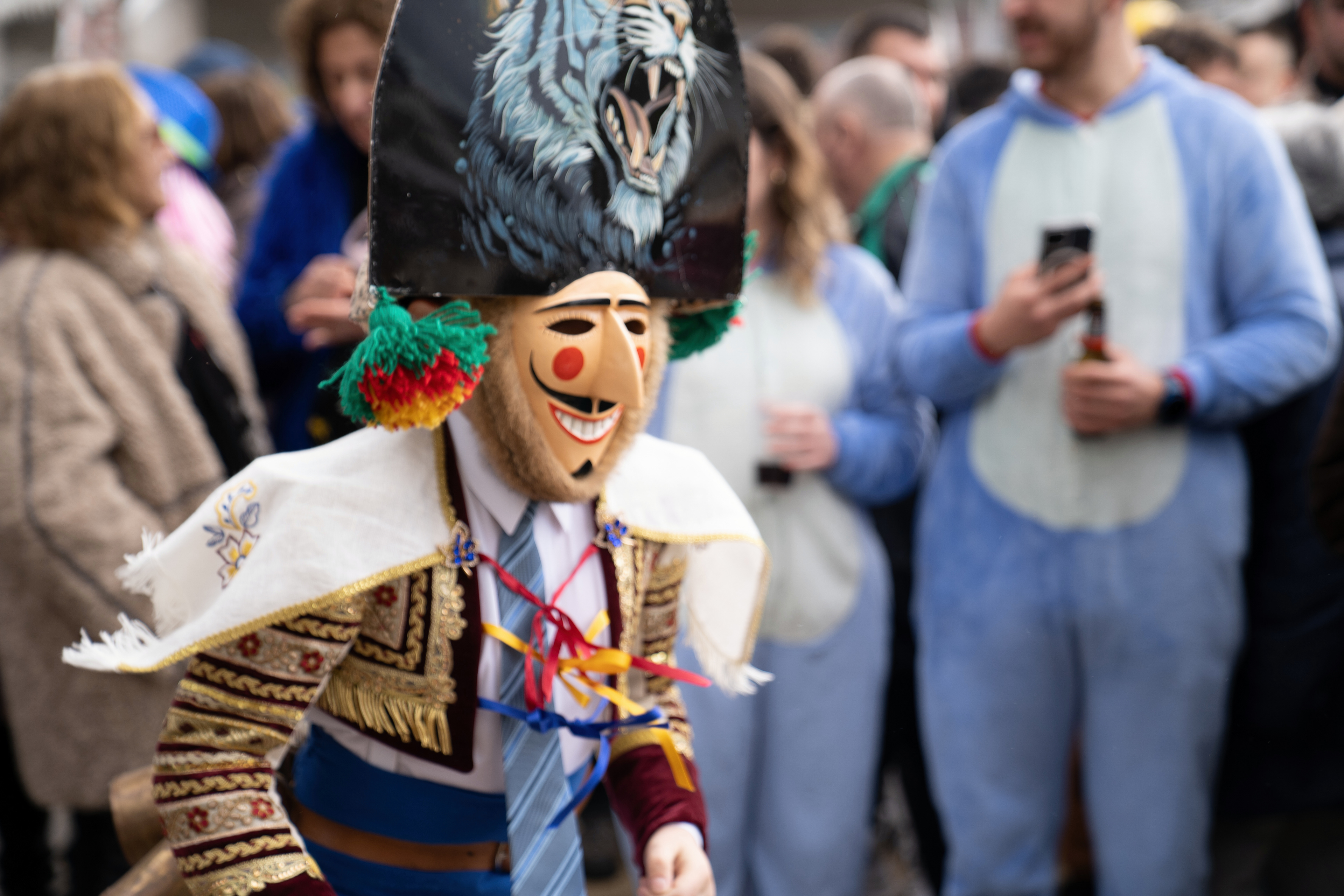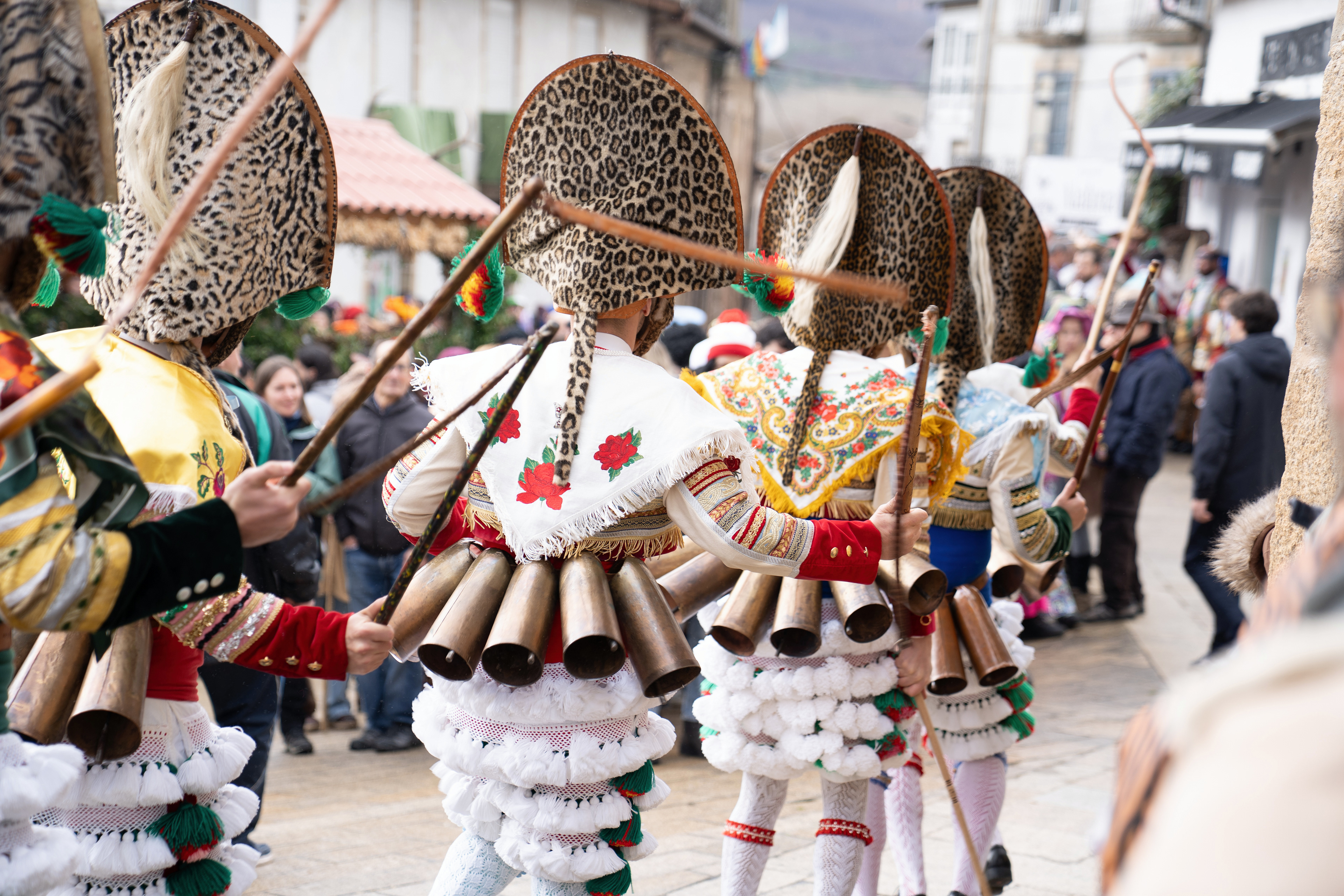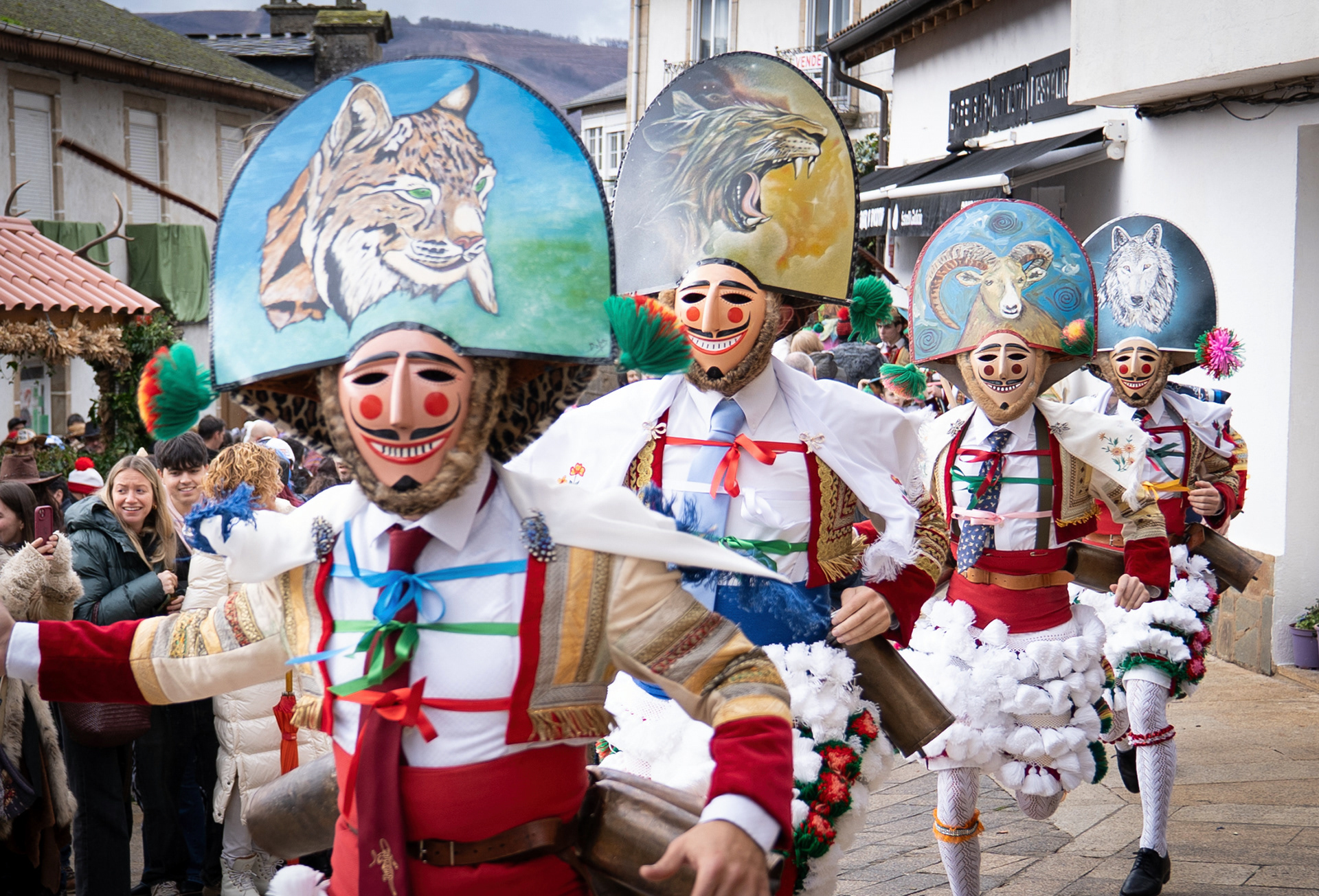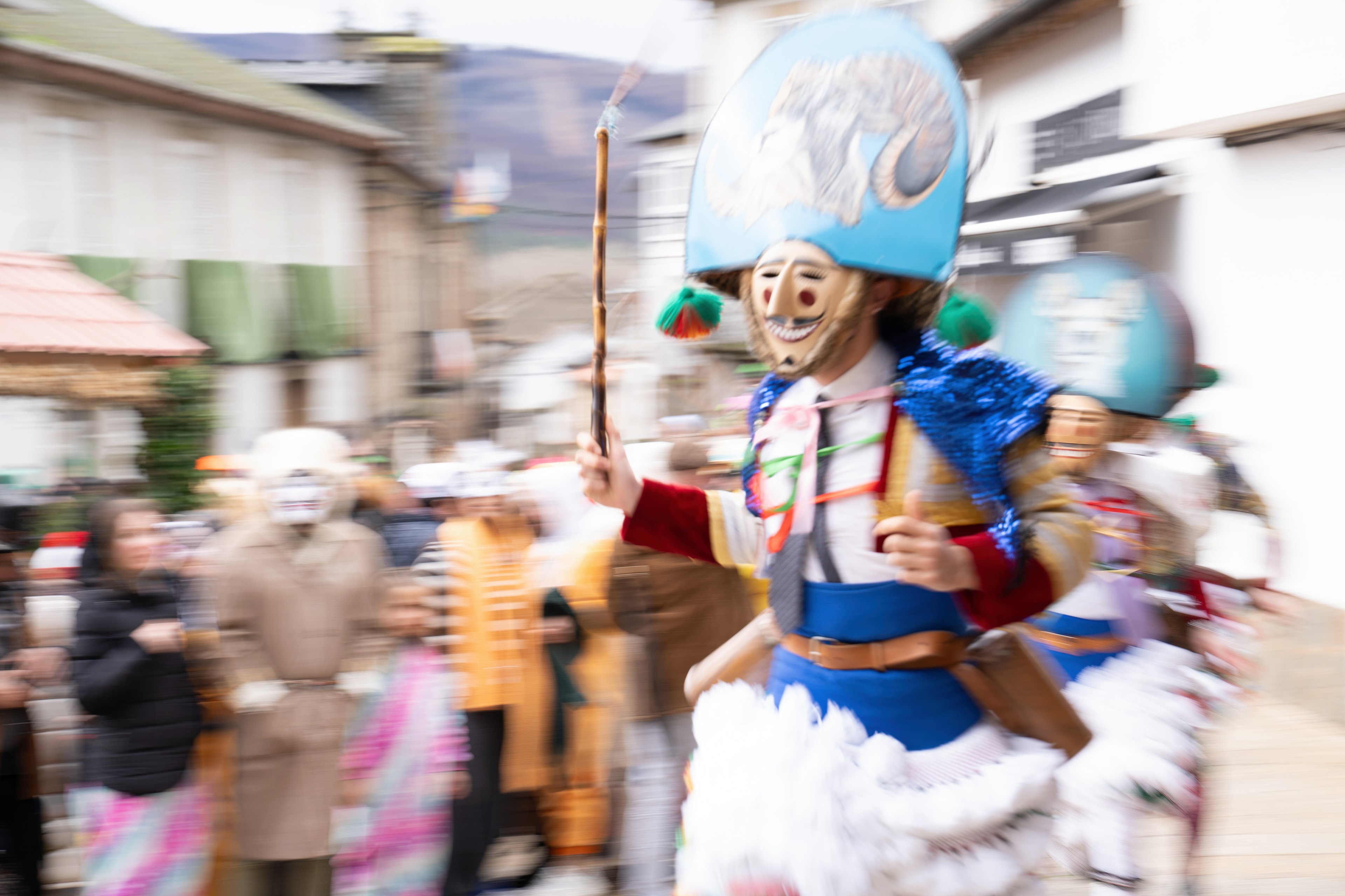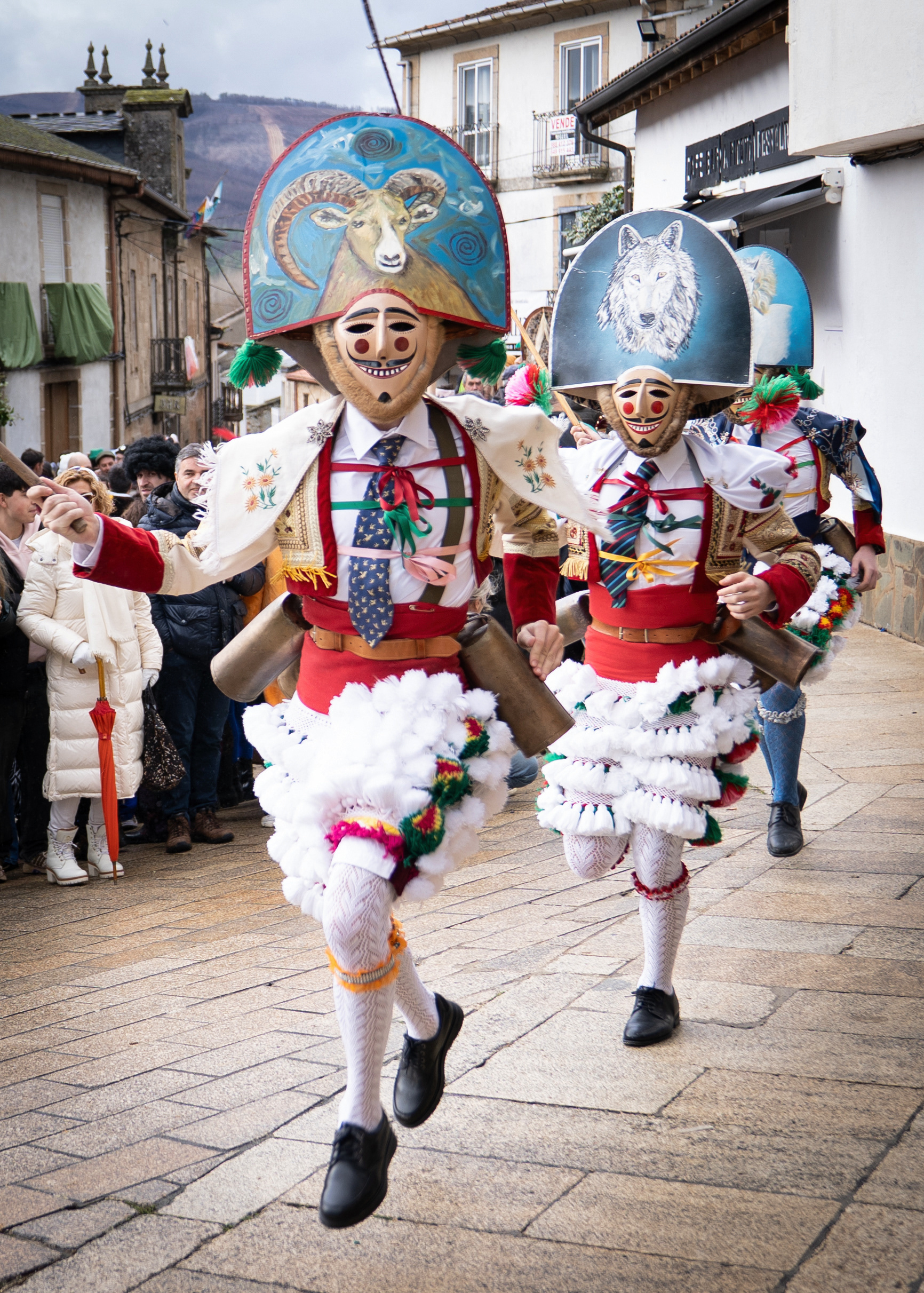 Los Felos de Maceda Aunque a menudo se confunden con los Peliqueiros de Laza o los Cigarróns de Verín, los Felos de Maceda tienen una identidad propia y un carácter distintivo: La Vestimenta: Lucen una careta de madera tallada con una sonrisa burlona y una mitra de cartón decorada con motivos de la fauna local (habitualmente aves o lobos). Visten camisas blancas, corbata, una chaqueta corta con flecos y medias de lana negra. El Sonido: Lo más característico son las chocas (encerros) colgadas de un cinturón de cuero, que anuncian su llegada con un estruendo rítmico mientras corren o saltan. El Comportamiento: El Felo es una figura de autoridad absoluta. Tiene permiso para asustar, saltar sobre la gente y usar su látigo (zamarra), pero no se le puede tocar. Su origen se asocia a antiguos recaudadores de impuestos o vigilantes, mezclado con ritos de fertilidad. Diferenciación: A diferencia de sus "primos" de otras villas, los Felos suelen recorrer las aldeas de la sierra, manteniendo un espíritu más rural, salvaje y errante.