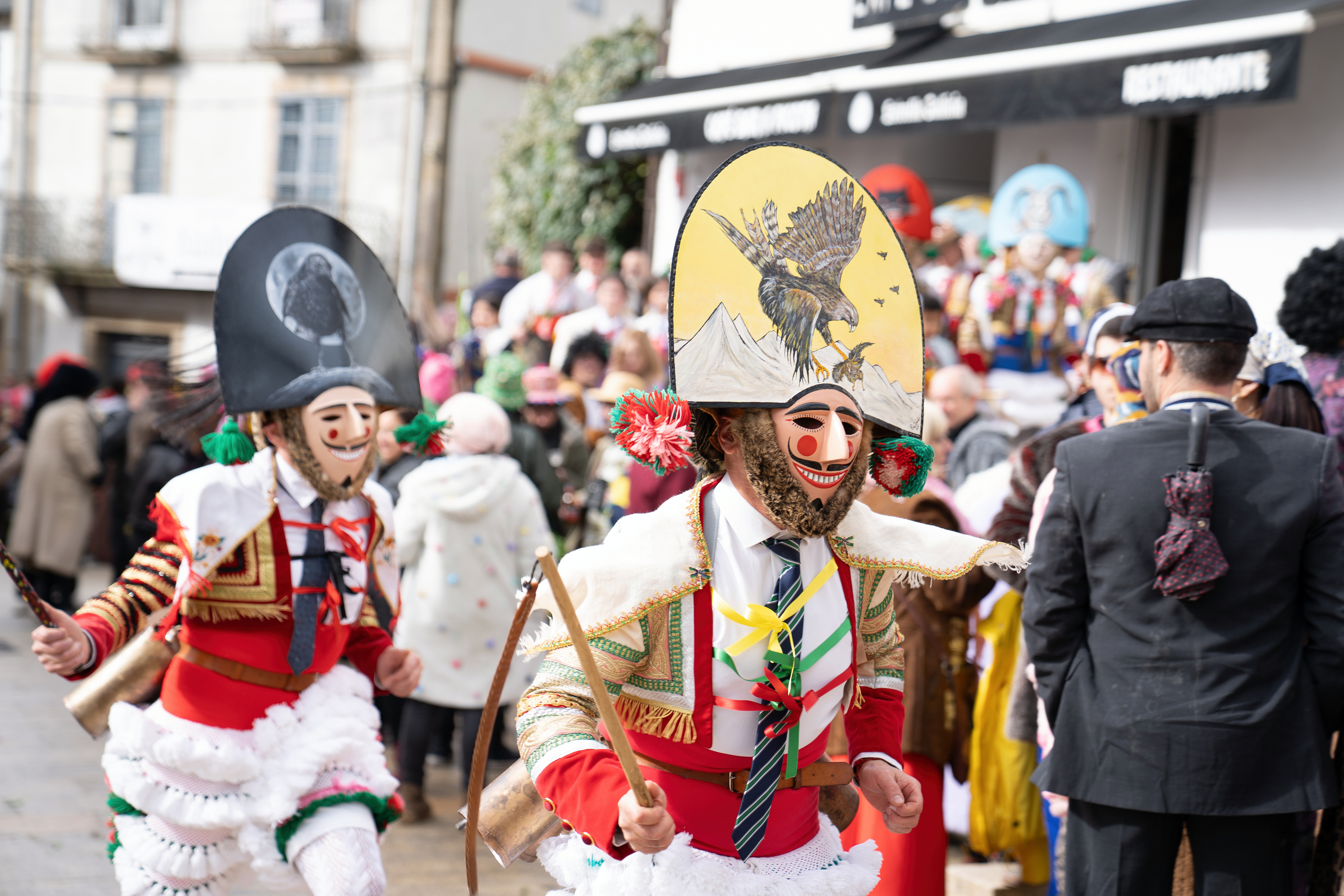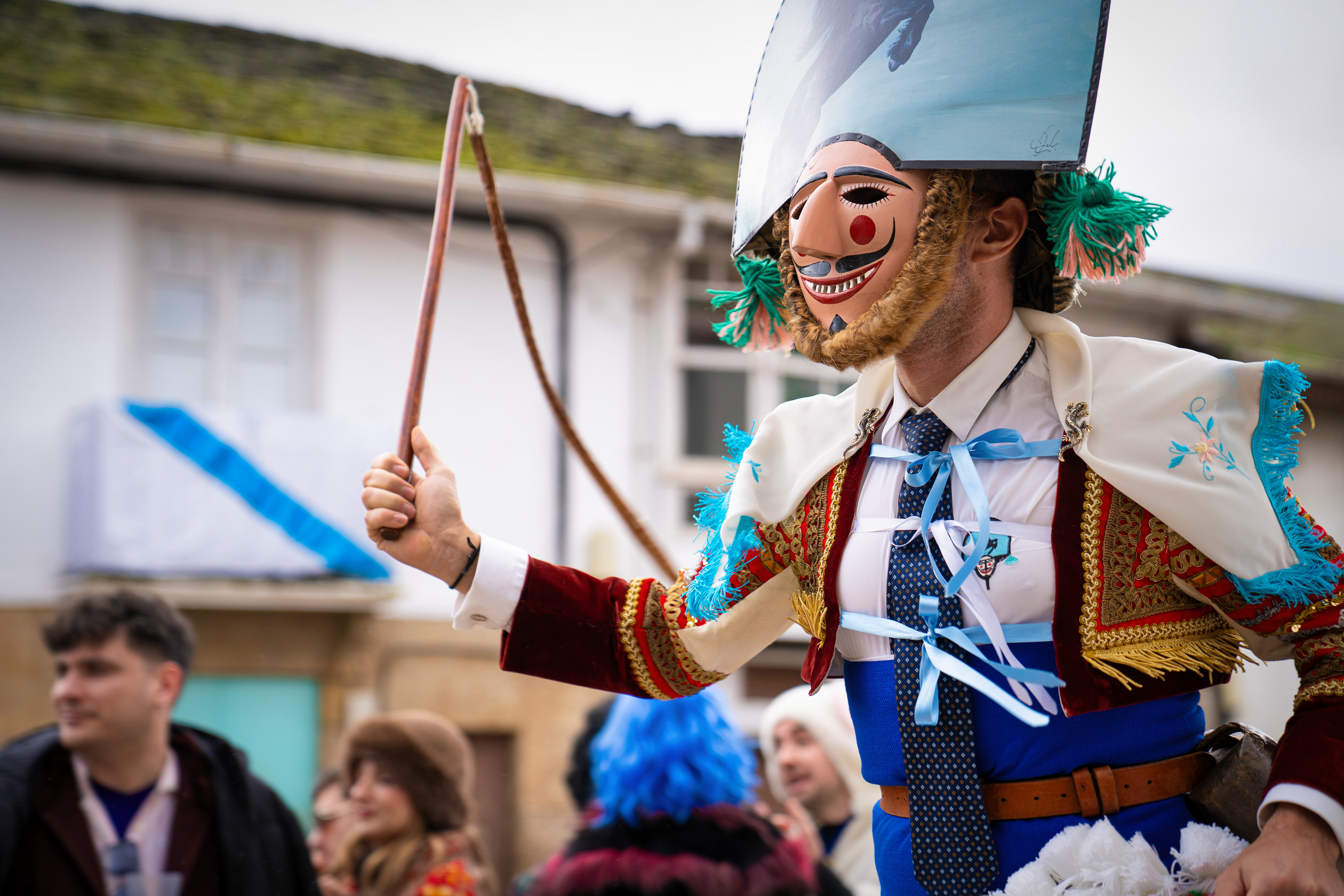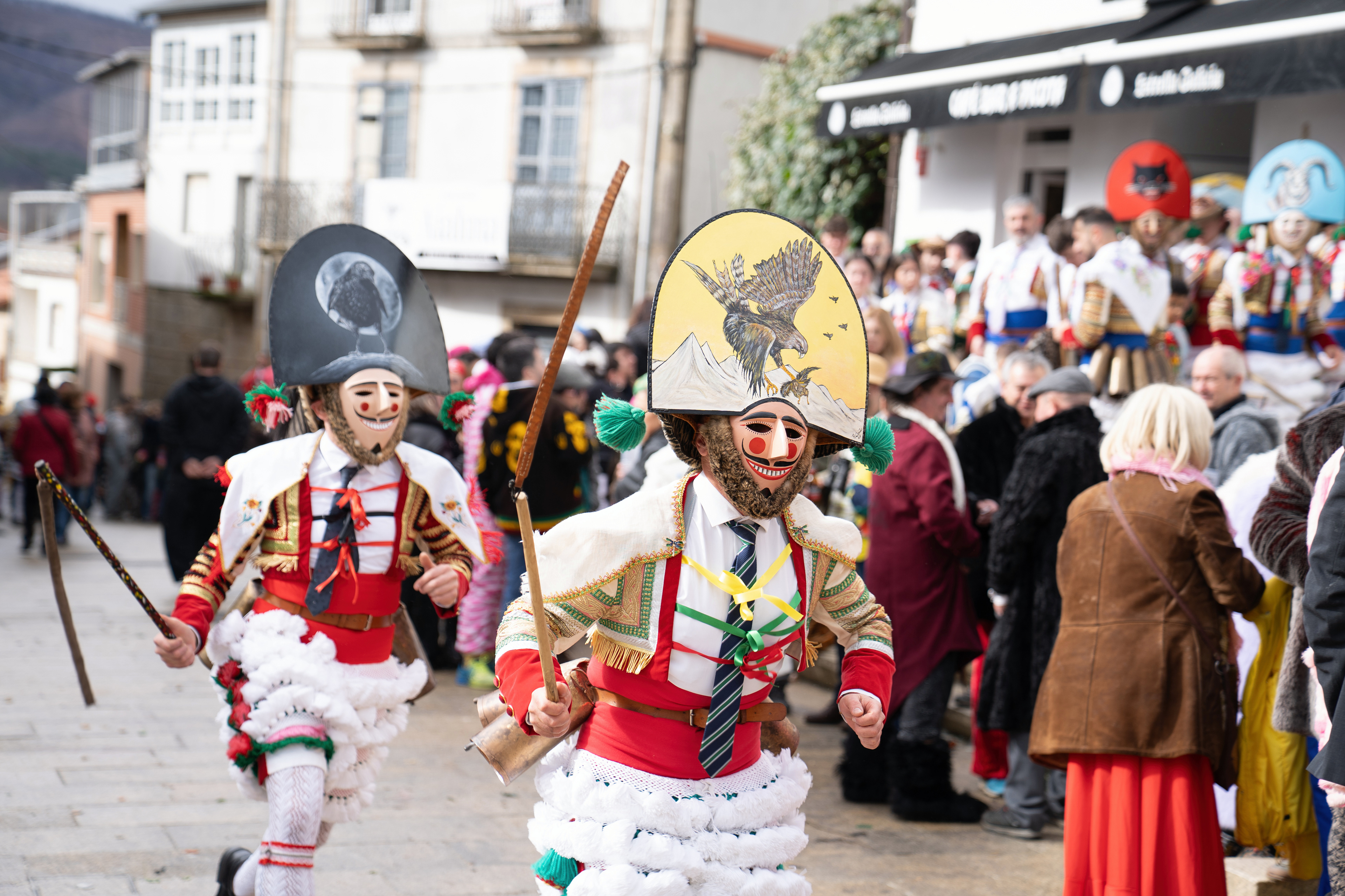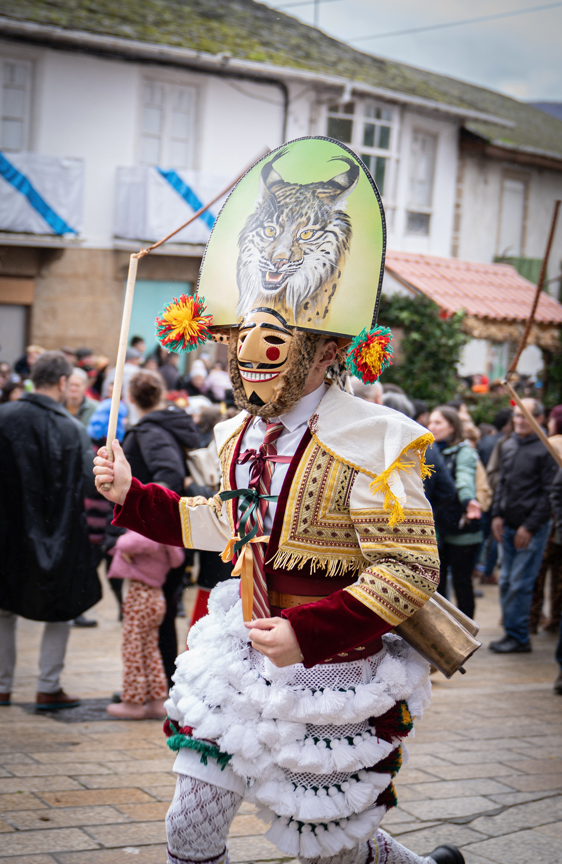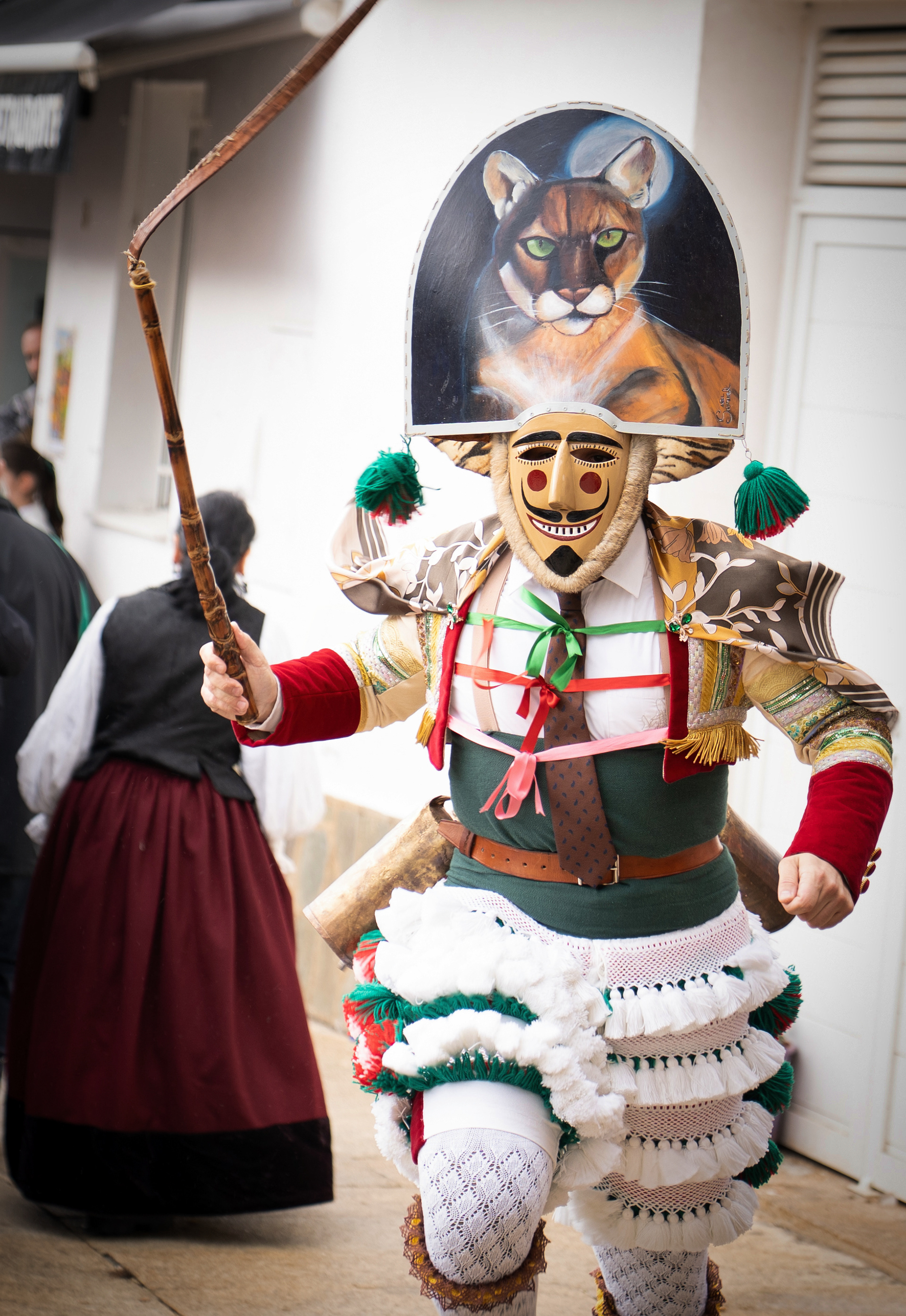 Los Felos de Maceda Aunque a menudo se confunden con los Peliqueiros de Laza o los Cigarróns de Verín, los Felos de Maceda tienen una identidad propia y un carácter distintivo: La Vestimenta: Lucen una careta de madera tallada con una sonrisa burlona y una mitra de cartón decorada con motivos de la fauna local (habitualmente aves o lobos). Visten camisas blancas, corbata, una chaqueta corta con flecos y medias de lana negra. El Sonido: Lo más característico son las chocas (encerros) colgadas de un cinturón de cuero, que anuncian su llegada con un estruendo rítmico mientras corren o saltan. El Comportamiento: El Felo es una figura de autoridad absoluta. Tiene permiso para asustar, saltar sobre la gente y usar su látigo (zamarra), pero no se le puede tocar. Su origen se asocia a antiguos recaudadores de impuestos o vigilantes, mezclado con ritos de fertilidad. Diferenciación: A diferencia de sus "primos" de otras villas, los Felos suelen recorrer las aldeas de la sierra, manteniendo un espíritu más rural, salvaje y errante.