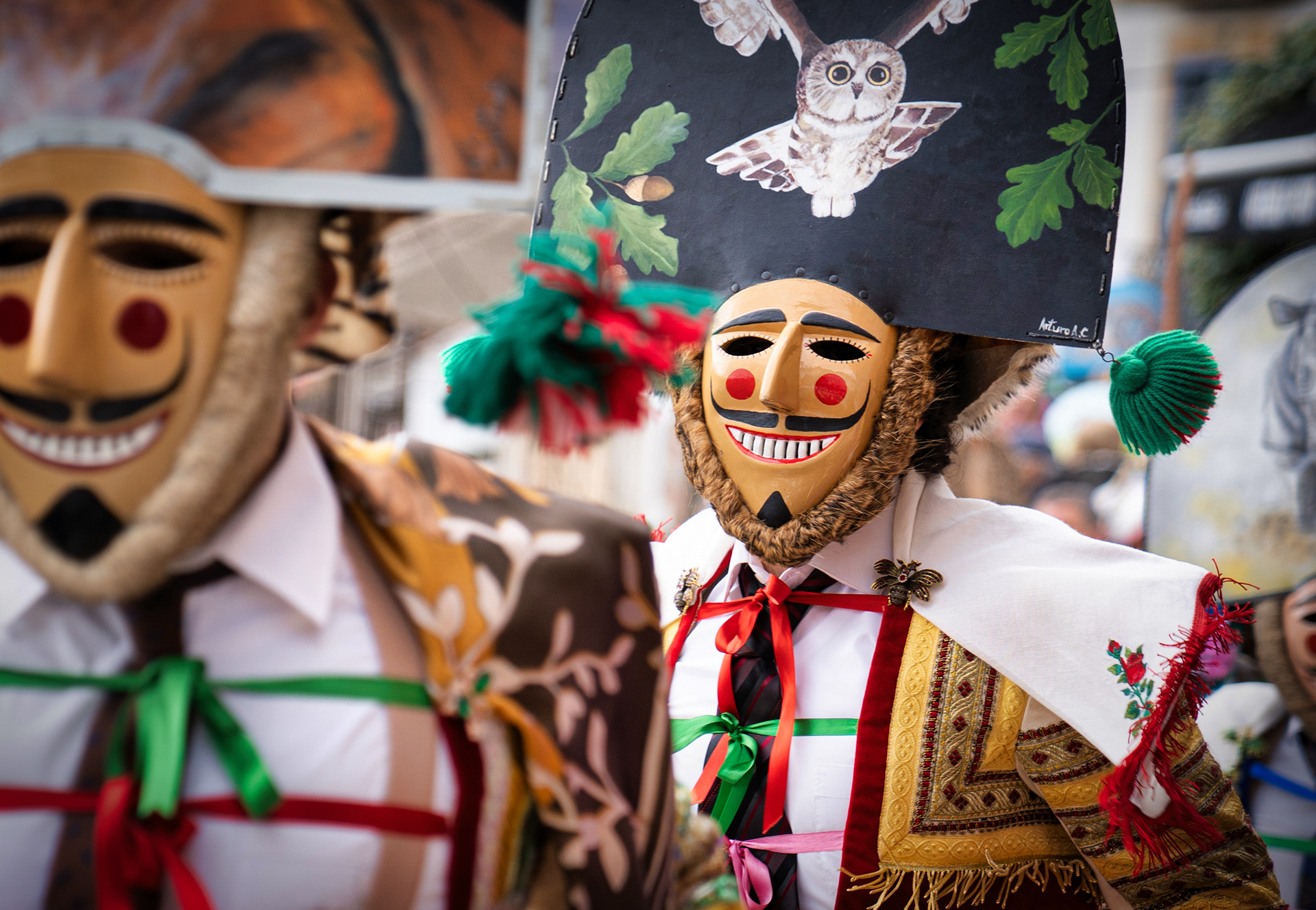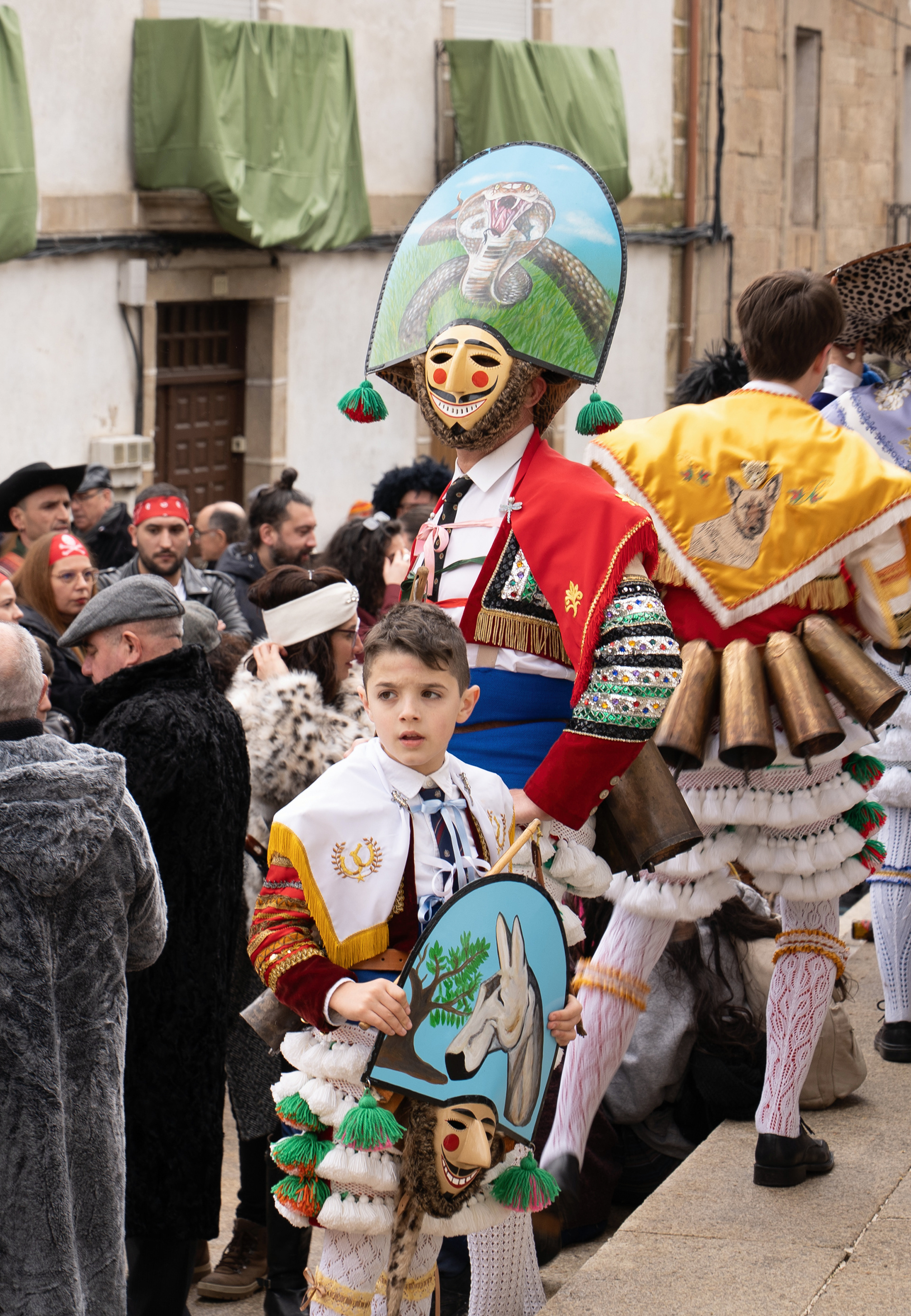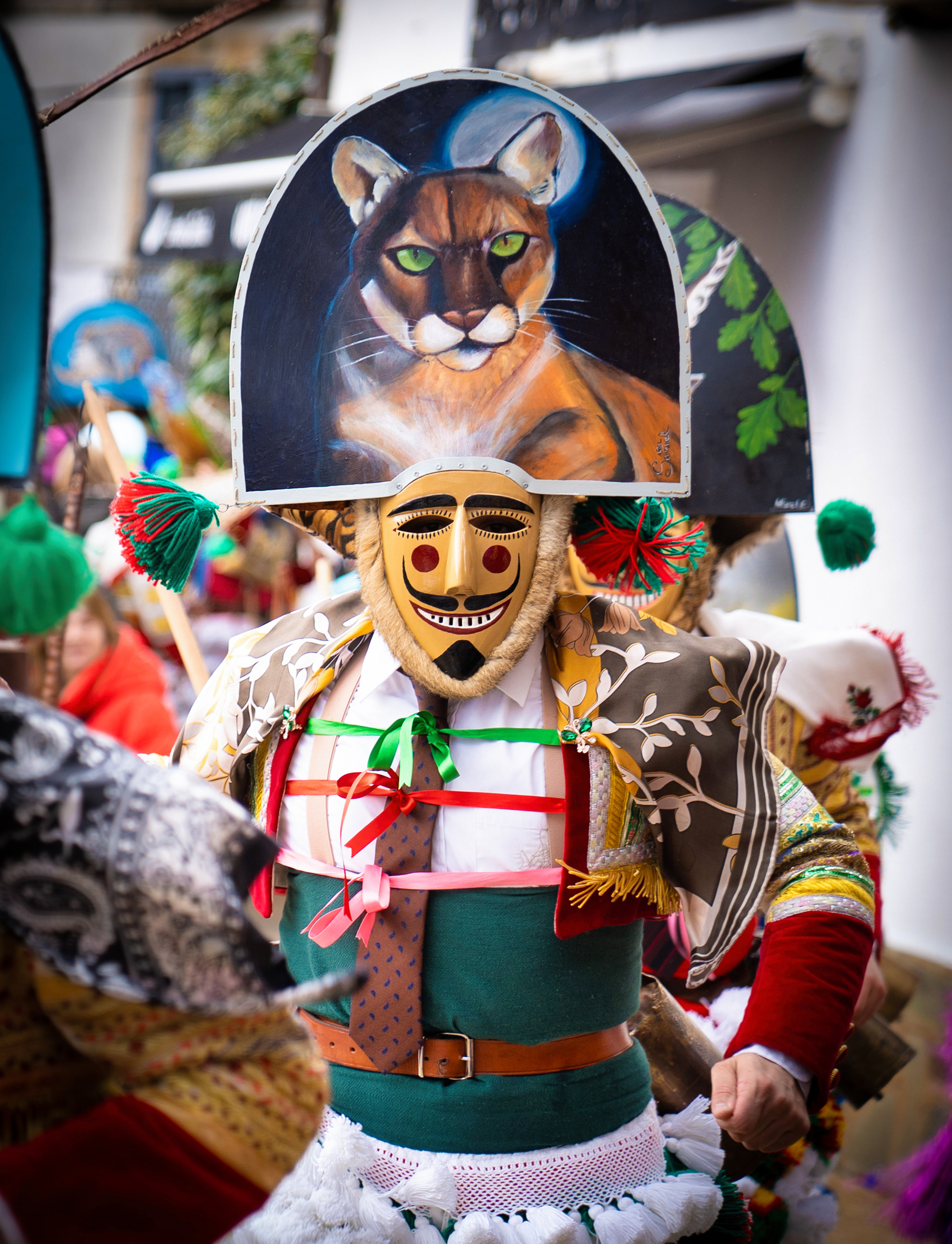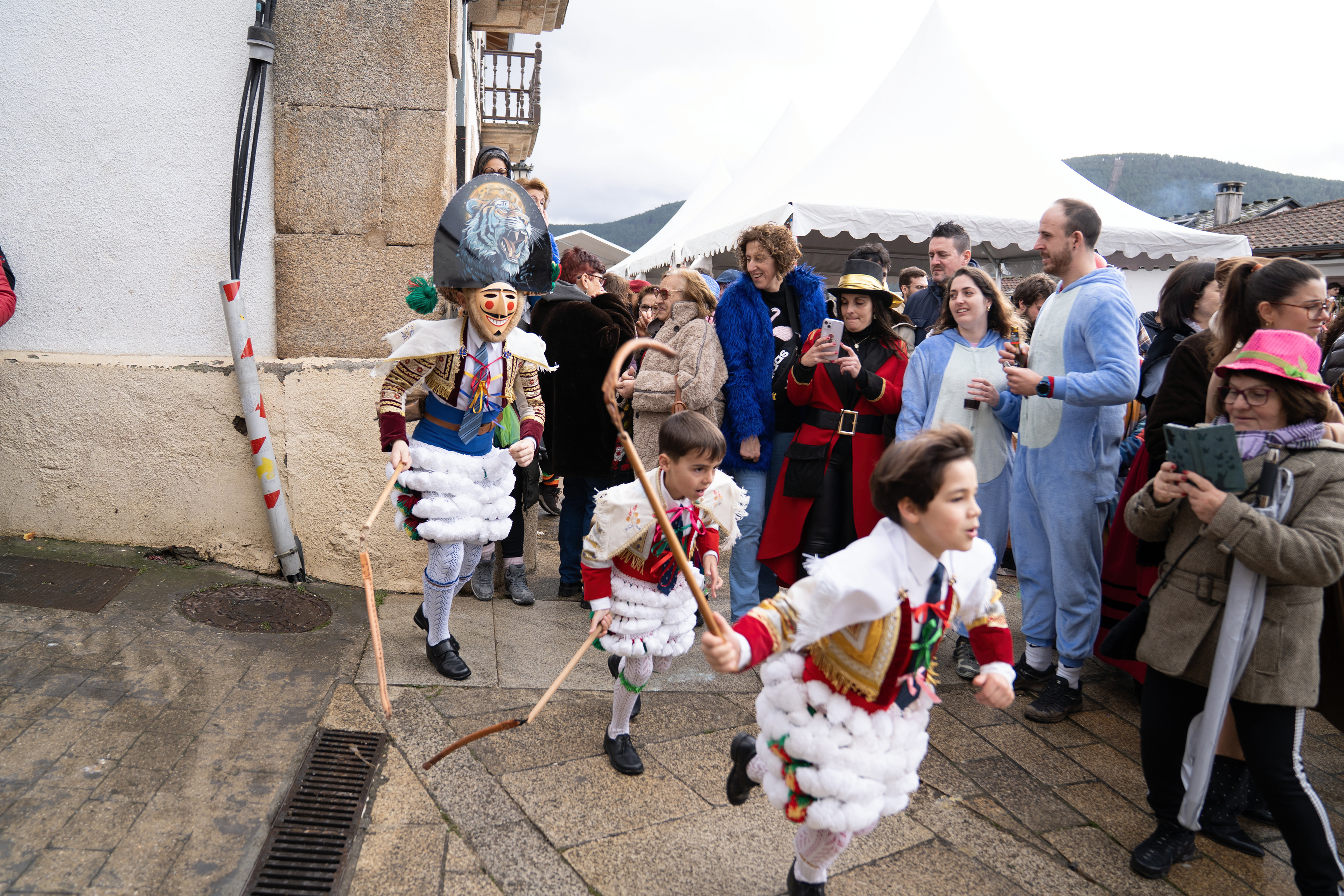 Los Felos de Maceda Aunque a menudo se confunden con los Peliqueiros de Laza o los Cigarróns de Verín, los Felos de Maceda tienen una identidad propia y un carácter distintivo: La Vestimenta: Lucen una careta de madera tallada con una sonrisa burlona y una mitra de cartón decorada con motivos de la fauna local (habitualmente aves o lobos). Visten camisas blancas, corbata, una chaqueta corta con flecos y medias de lana negra. El Sonido: Lo más característico son las chocas (encerros) colgadas de un cinturón de cuero, que anuncian su llegada con un estruendo rítmico mientras corren o saltan. El Comportamiento: El Felo es una figura de autoridad absoluta. Tiene permiso para asustar, saltar sobre la gente y usar su látigo (zamarra), pero no se le puede tocar. Su origen se asocia a antiguos recaudadores de impuestos o vigilantes, mezclado con ritos de fertilidad. Diferenciación: A diferencia de sus "primos" de otras villas, los Felos suelen recorrer las aldeas de la sierra, manteniendo un espíritu más rural, salvaje y errante.
