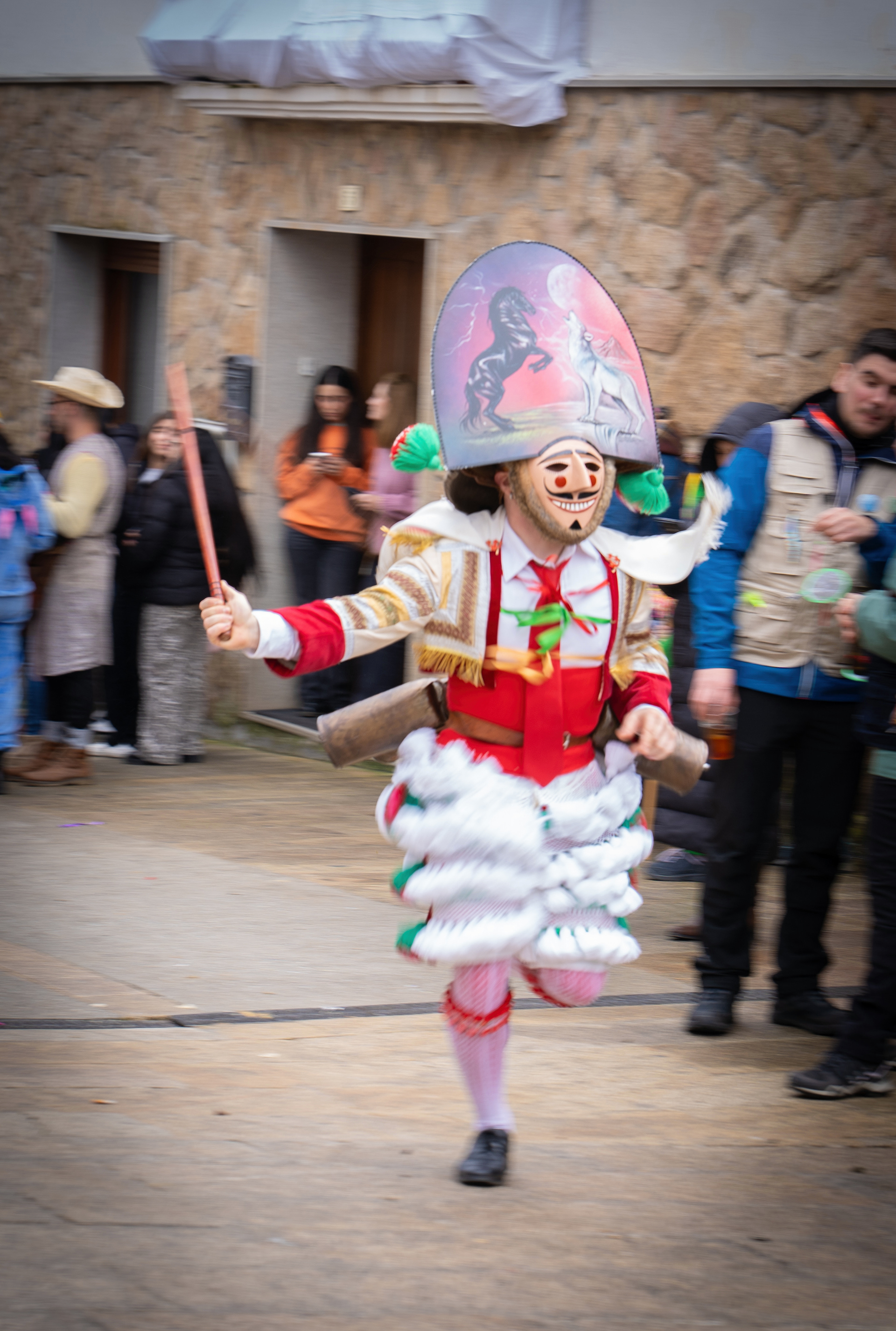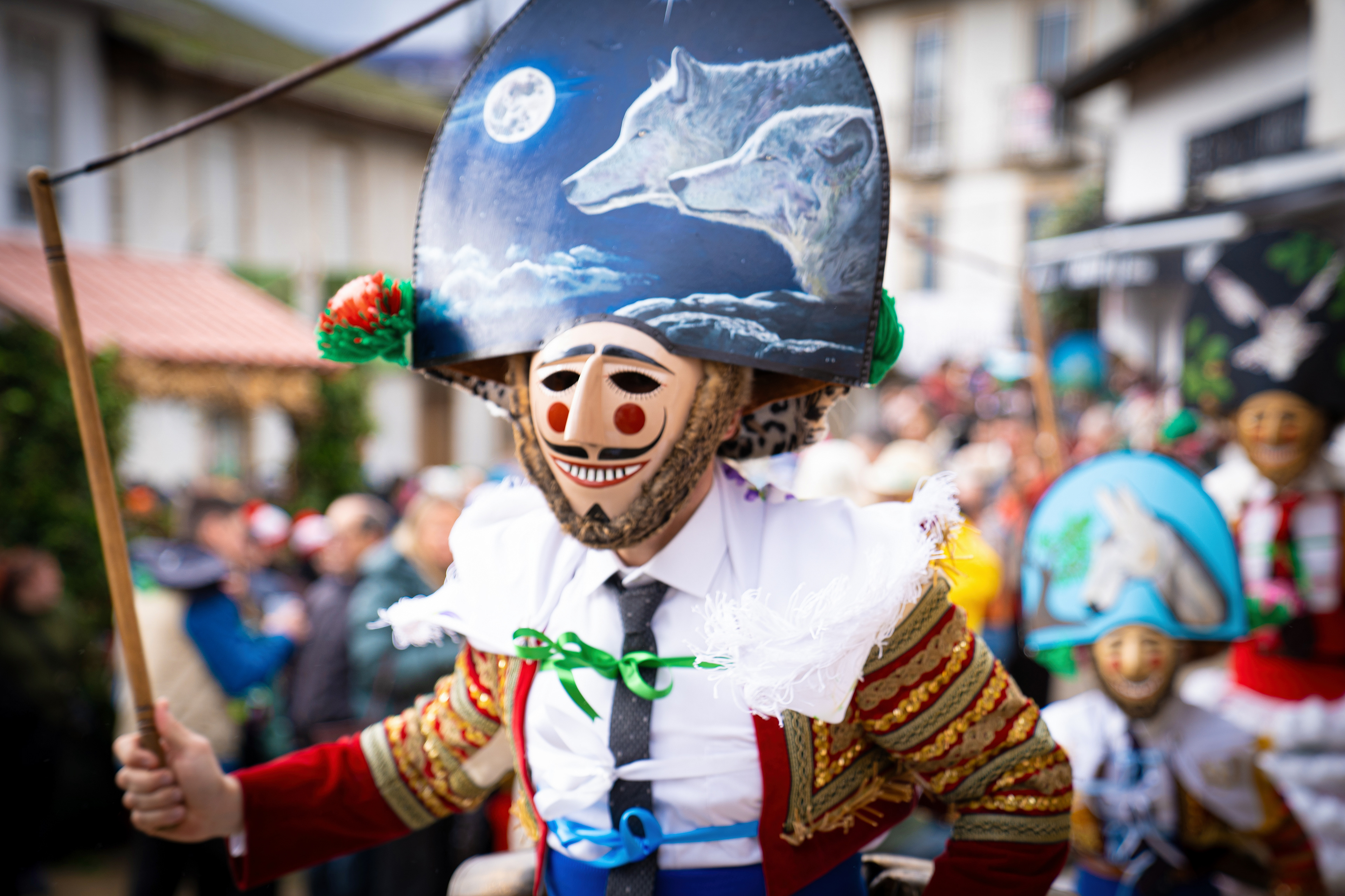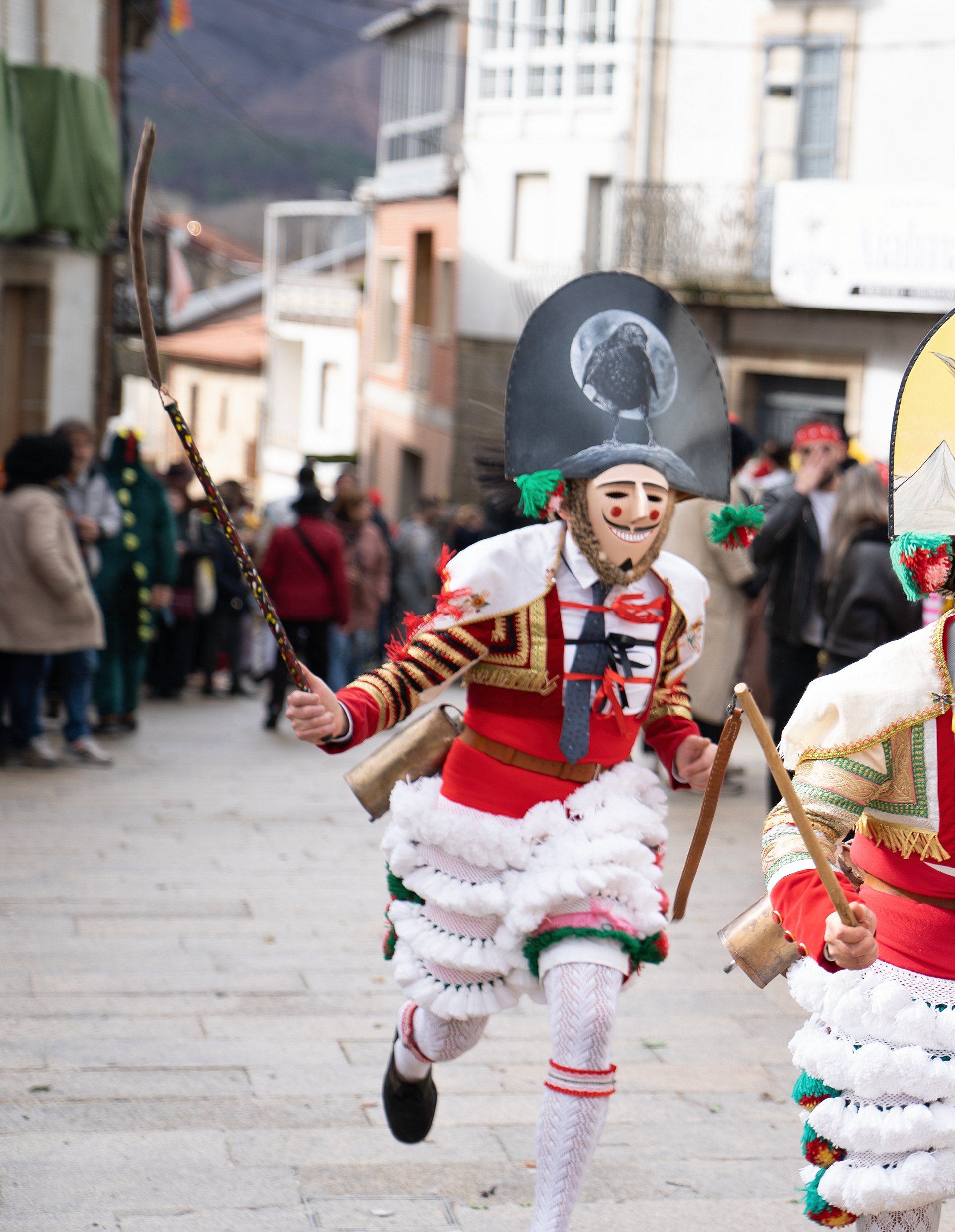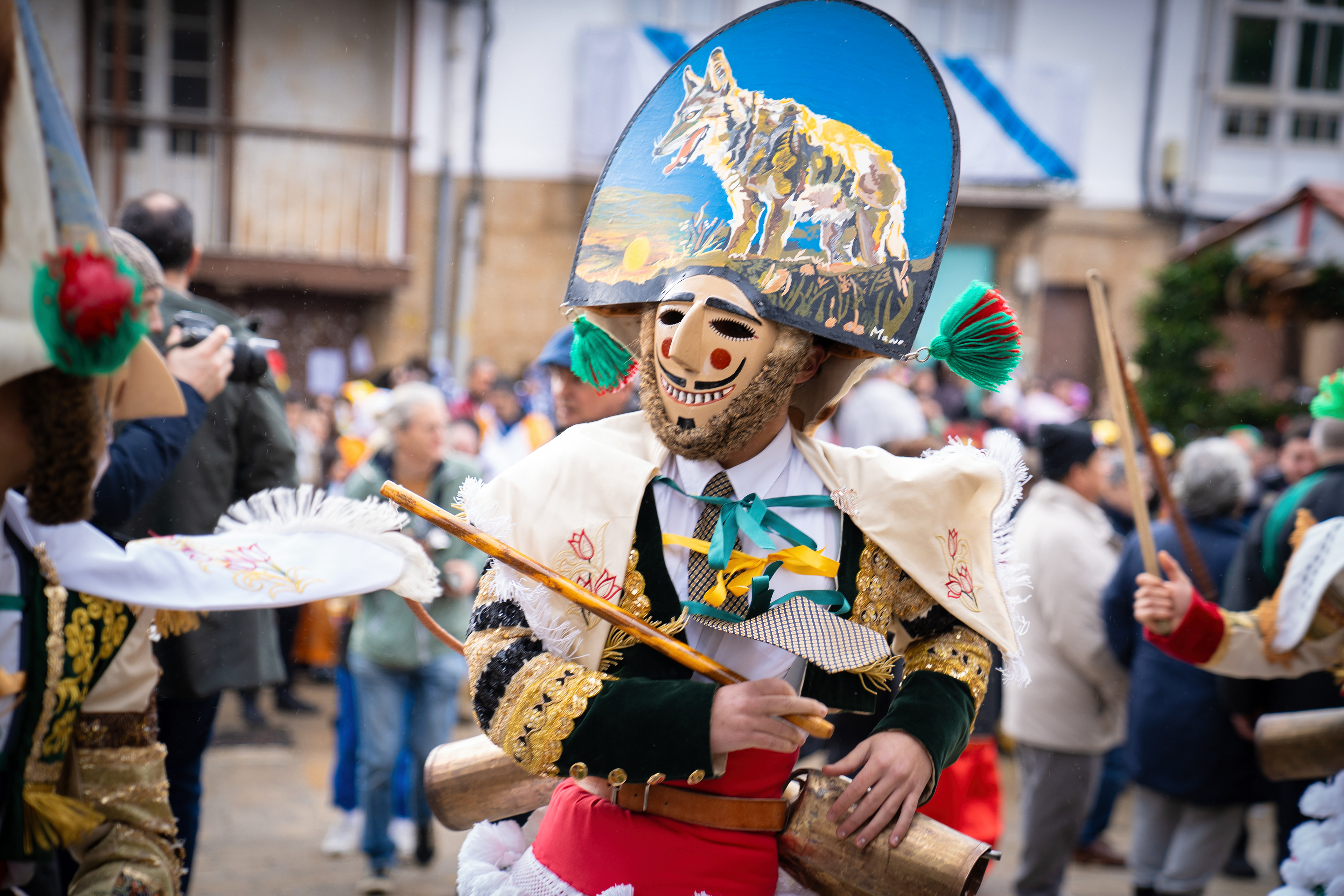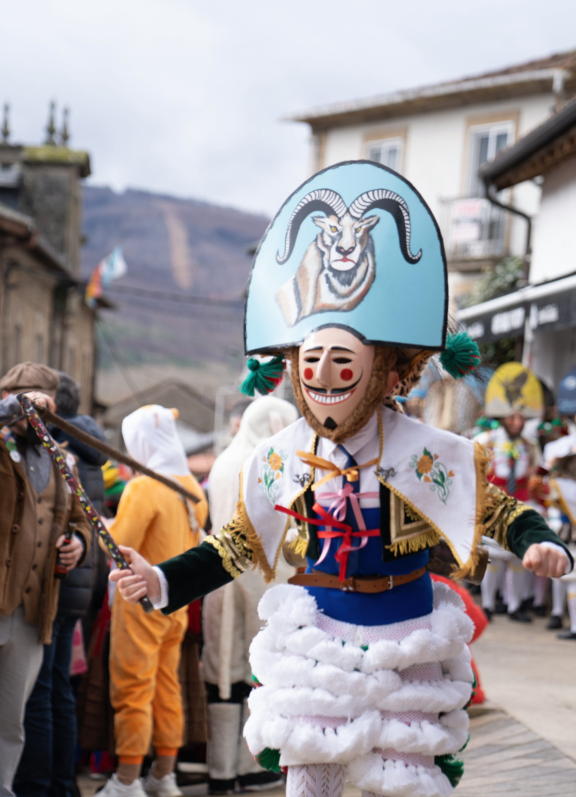 Los Felos de Maceda Aunque a menudo se confunden con los Peliqueiros de Laza o los Cigarróns de Verín, los Felos de Maceda tienen una identidad propia y un carácter distintivo: La Vestimenta: Lucen una careta de madera tallada con una sonrisa burlona y una mitra de cartón decorada con motivos de la fauna local (habitualmente aves o lobos). Visten camisas blancas, corbata, una chaqueta corta con flecos y medias de lana negra. El Sonido: Lo más característico son las chocas (encerros) colgadas de un cinturón de cuero, que anuncian su llegada con un estruendo rítmico mientras corren o saltan. El Comportamiento: El Felo es una figura de autoridad absoluta. Tiene permiso para asustar, saltar sobre la gente y usar su látigo (zamarra), pero no se le puede tocar. Su origen se asocia a antiguos recaudadores de impuestos o vigilantes, mezclado con ritos de fertilidad. Diferenciación: A diferencia de sus "primos" de otras villas, los Felos suelen recorrer las aldeas de la sierra, manteniendo un espíritu más rural, salvaje y errante.