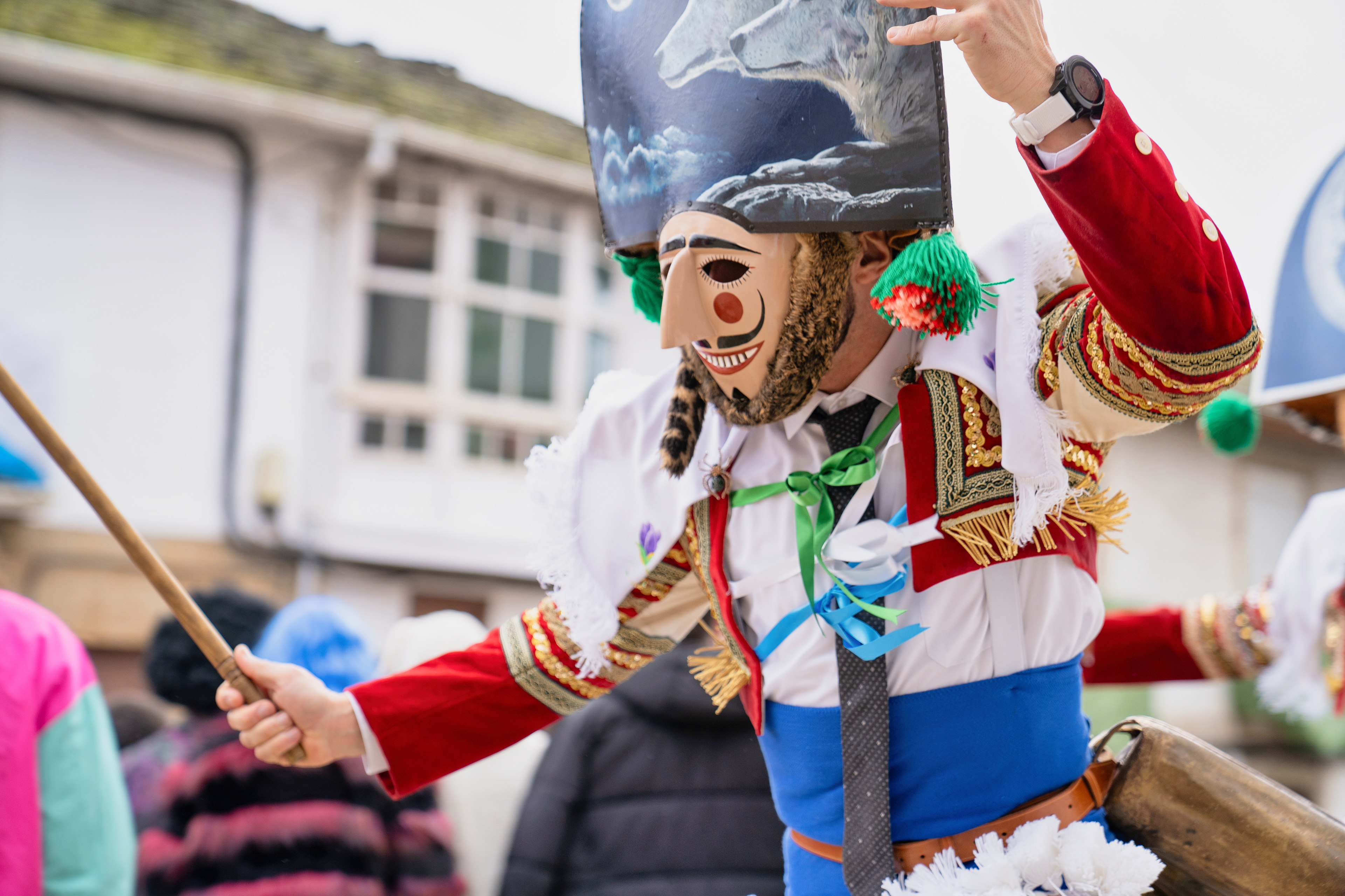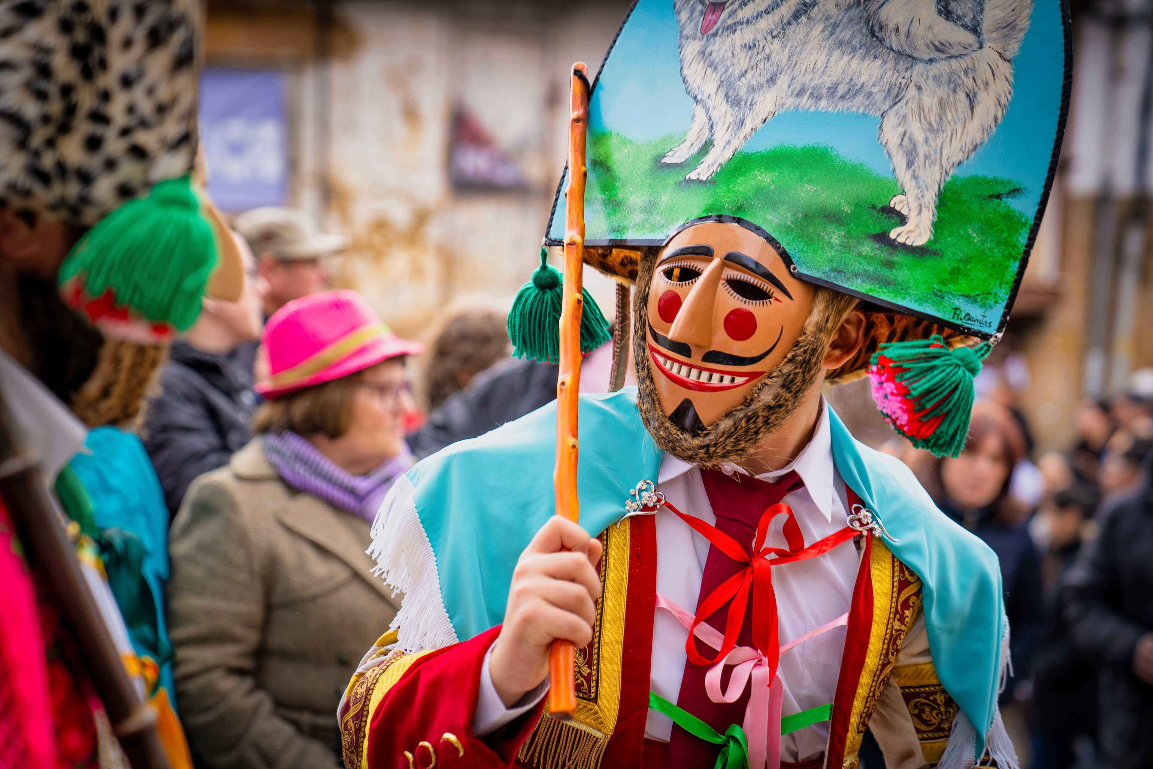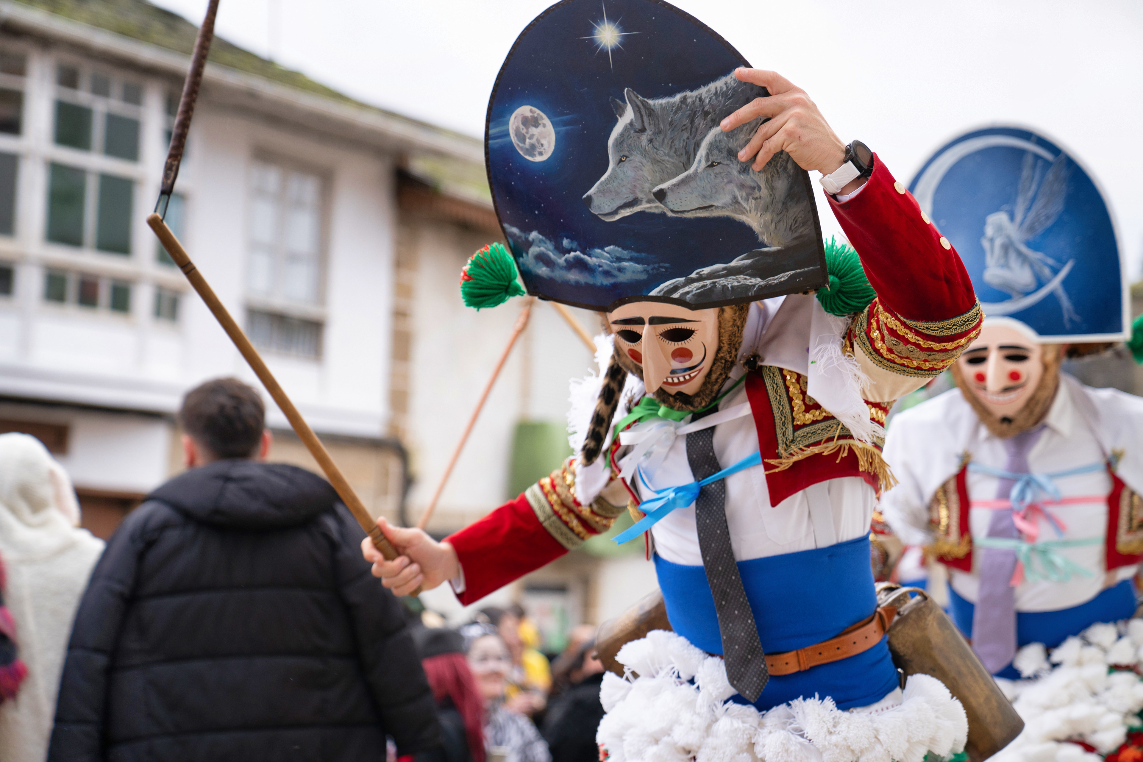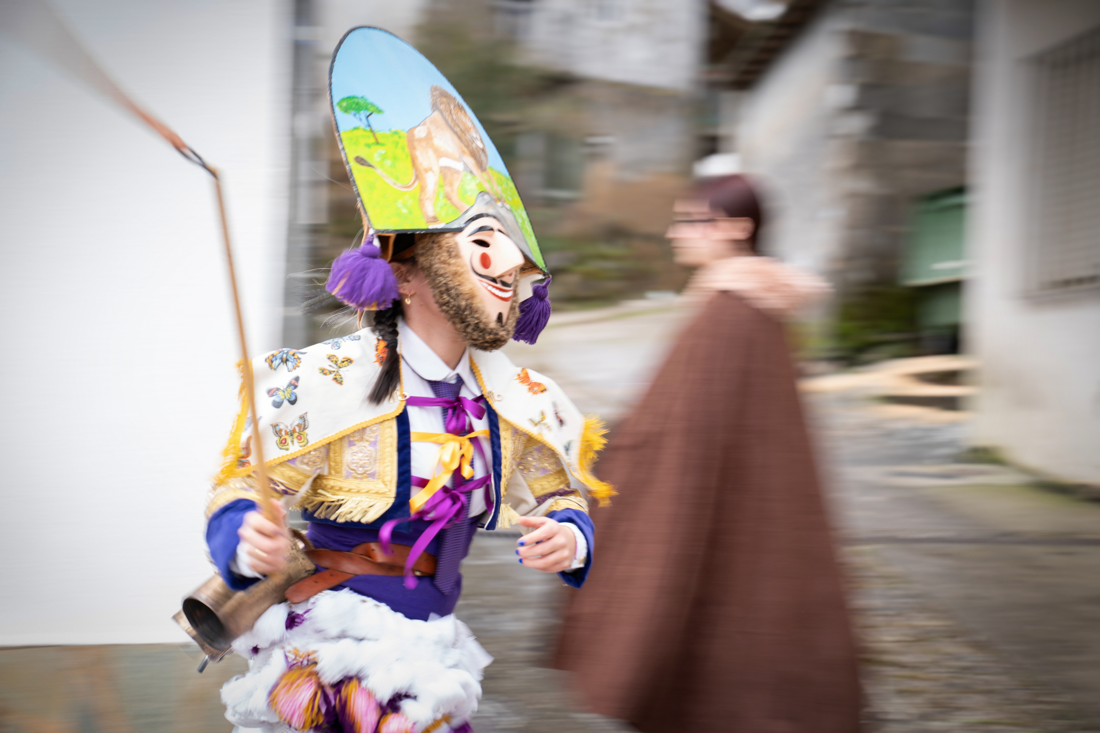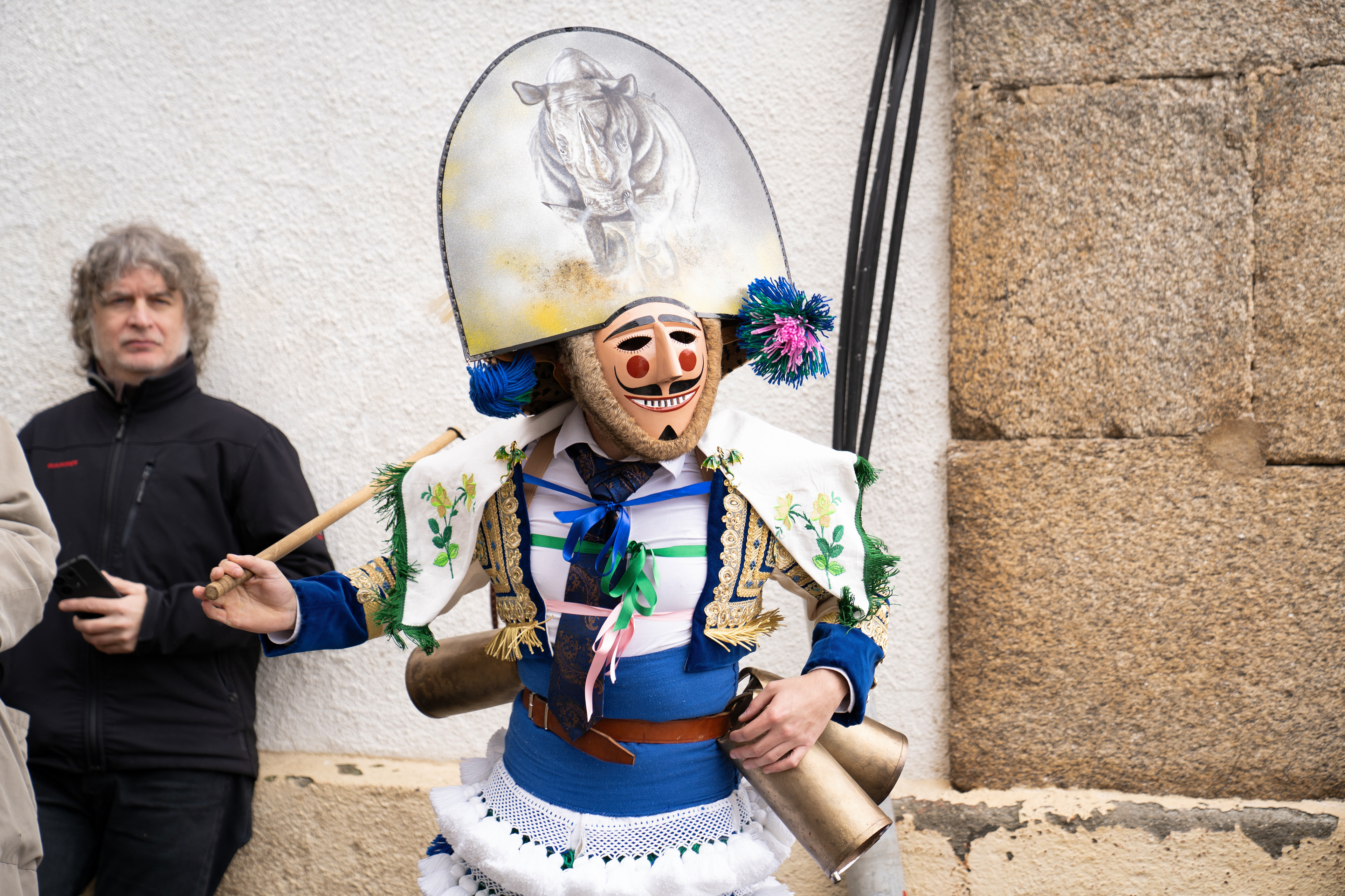 Los Felos de Maceda Aunque a menudo se confunden con los Peliqueiros de Laza o los Cigarróns de Verín, los Felos de Maceda tienen una identidad propia y un carácter distintivo: La Vestimenta: Lucen una careta de madera tallada con una sonrisa burlona y una mitra de cartón decorada con motivos de la fauna local (habitualmente aves o lobos). Visten camisas blancas, corbata, una chaqueta corta con flecos y medias de lana negra. El Sonido: Lo más característico son las chocas (encerros) colgadas de un cinturón de cuero, que anuncian su llegada con un estruendo rítmico mientras corren o saltan. El Comportamiento: El Felo es una figura de autoridad absoluta. Tiene permiso para asustar, saltar sobre la gente y usar su látigo (zamarra), pero no se le puede tocar. Su origen se asocia a antiguos recaudadores de impuestos o vigilantes, mezclado con ritos de fertilidad. Diferenciación: A diferencia de sus "primos" de otras villas, los Felos suelen recorrer las aldeas de la sierra, manteniendo un espíritu más rural, salvaje y errante.