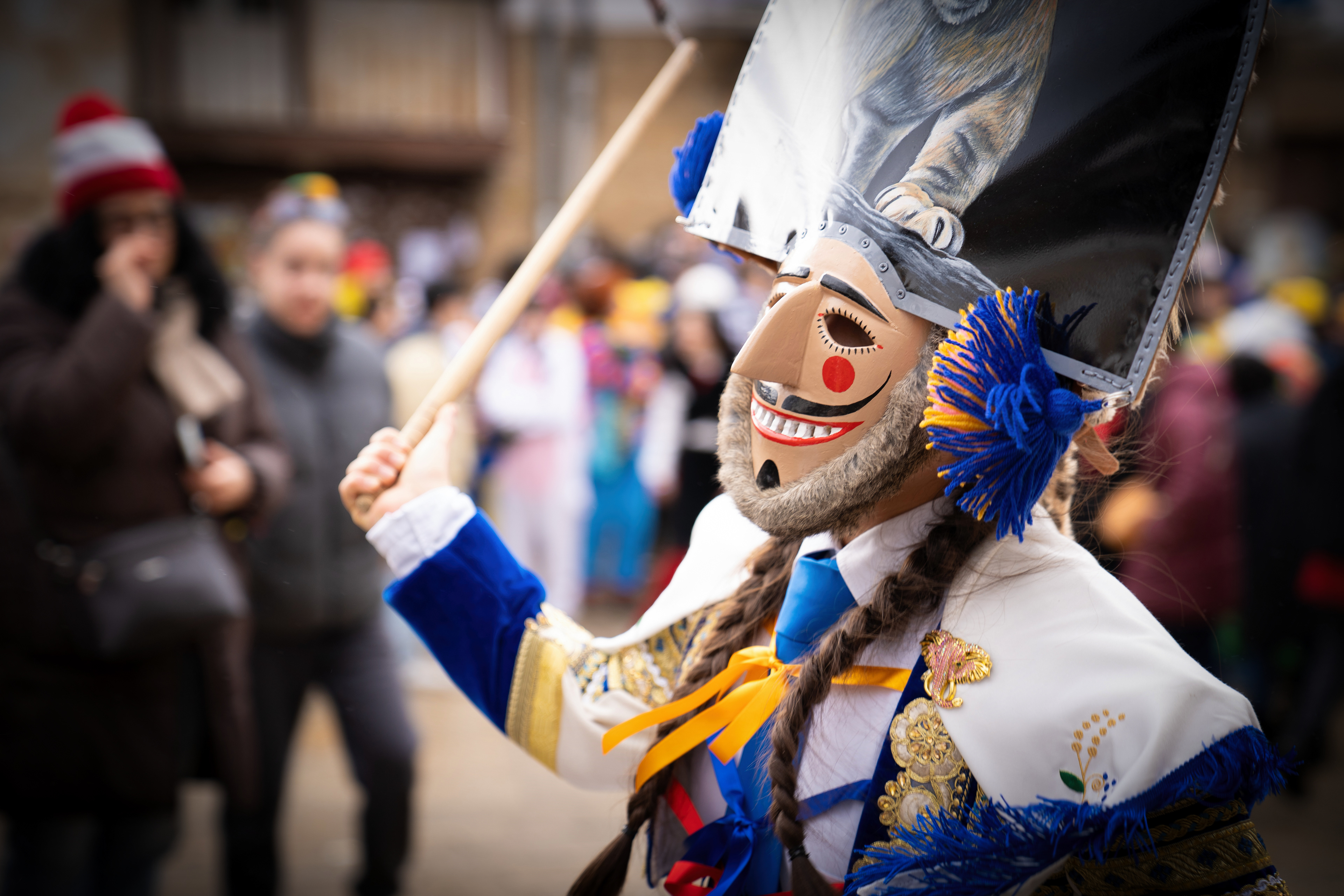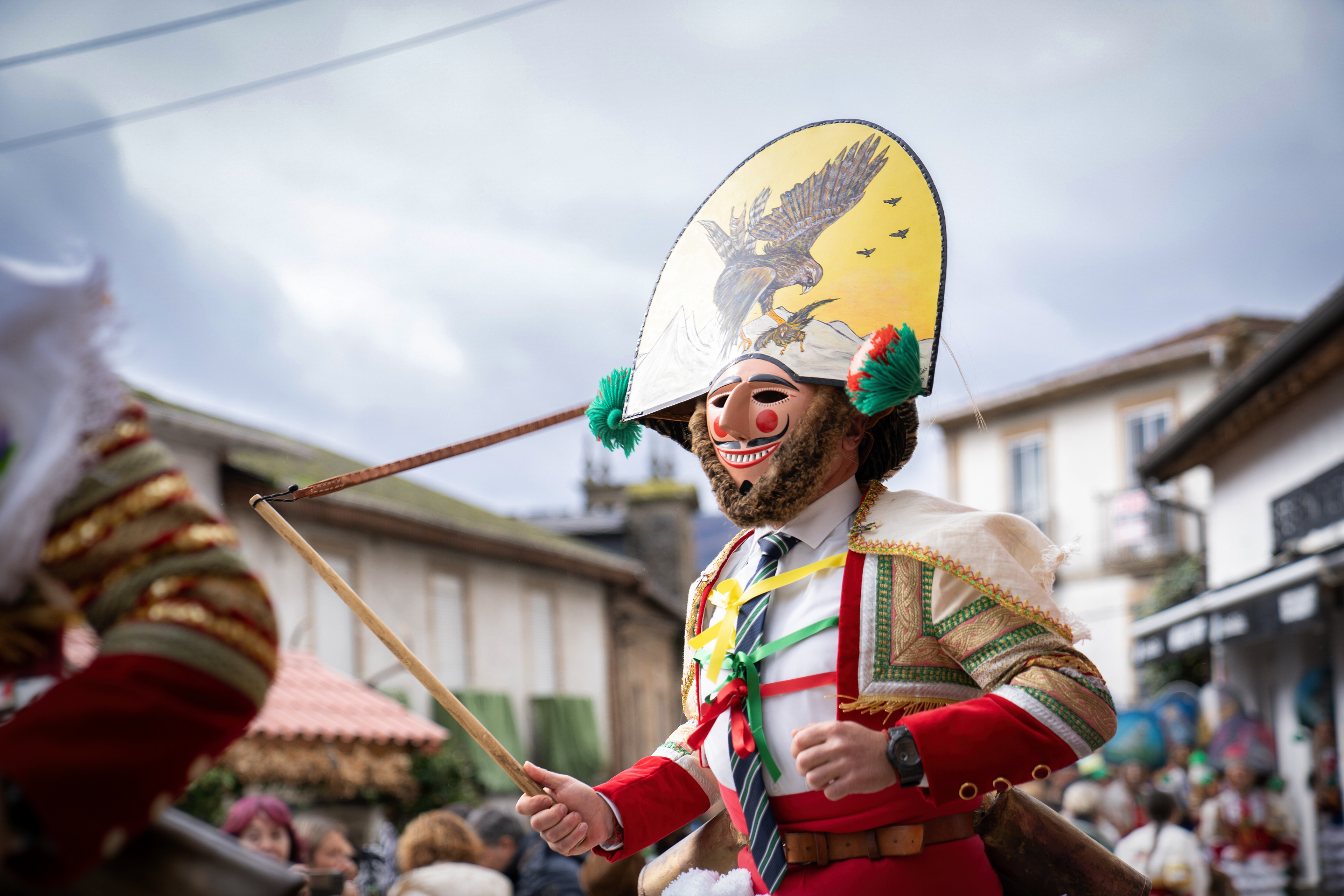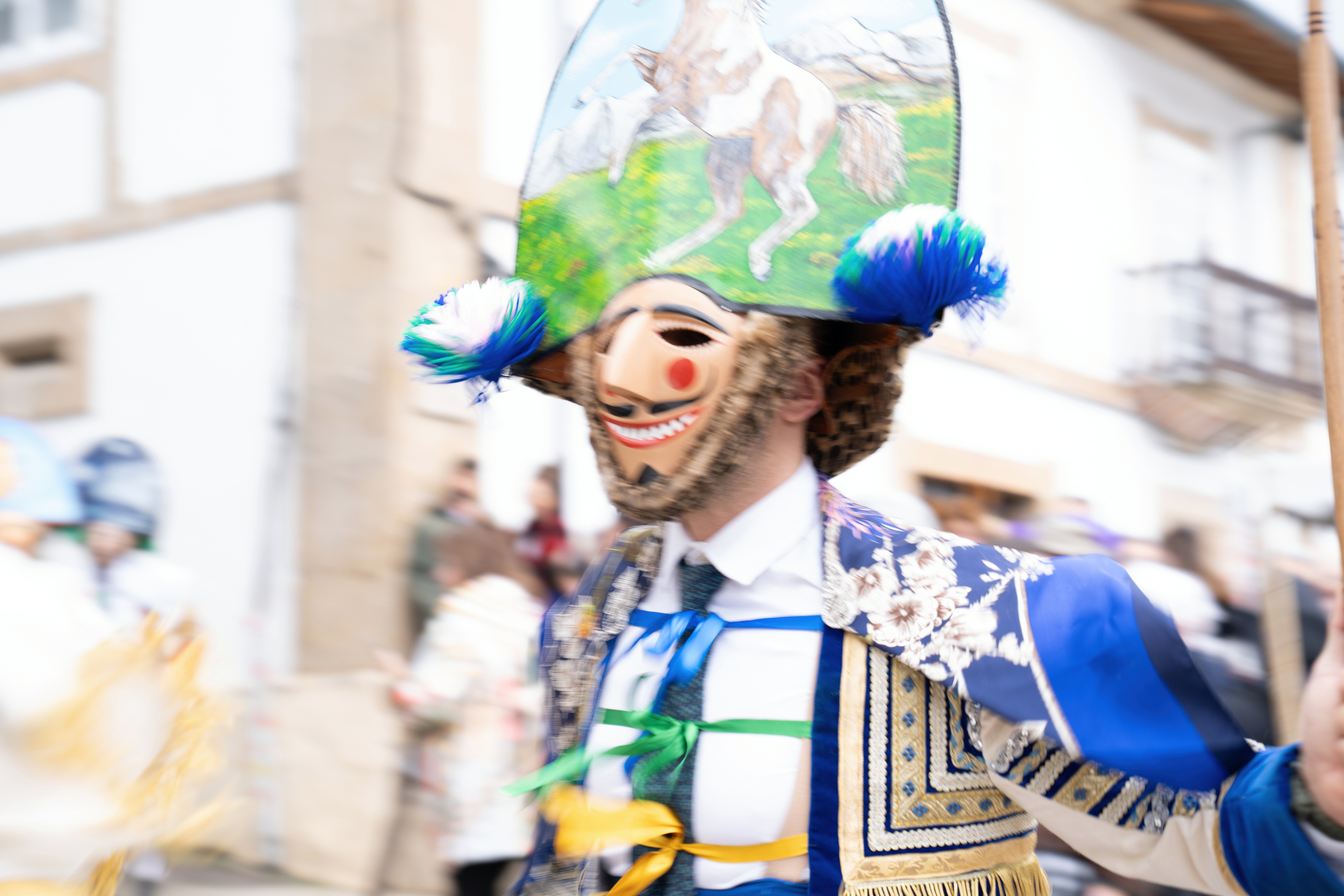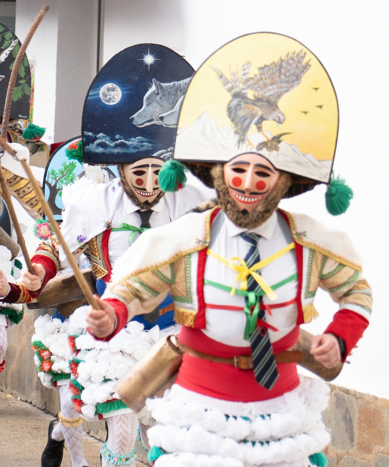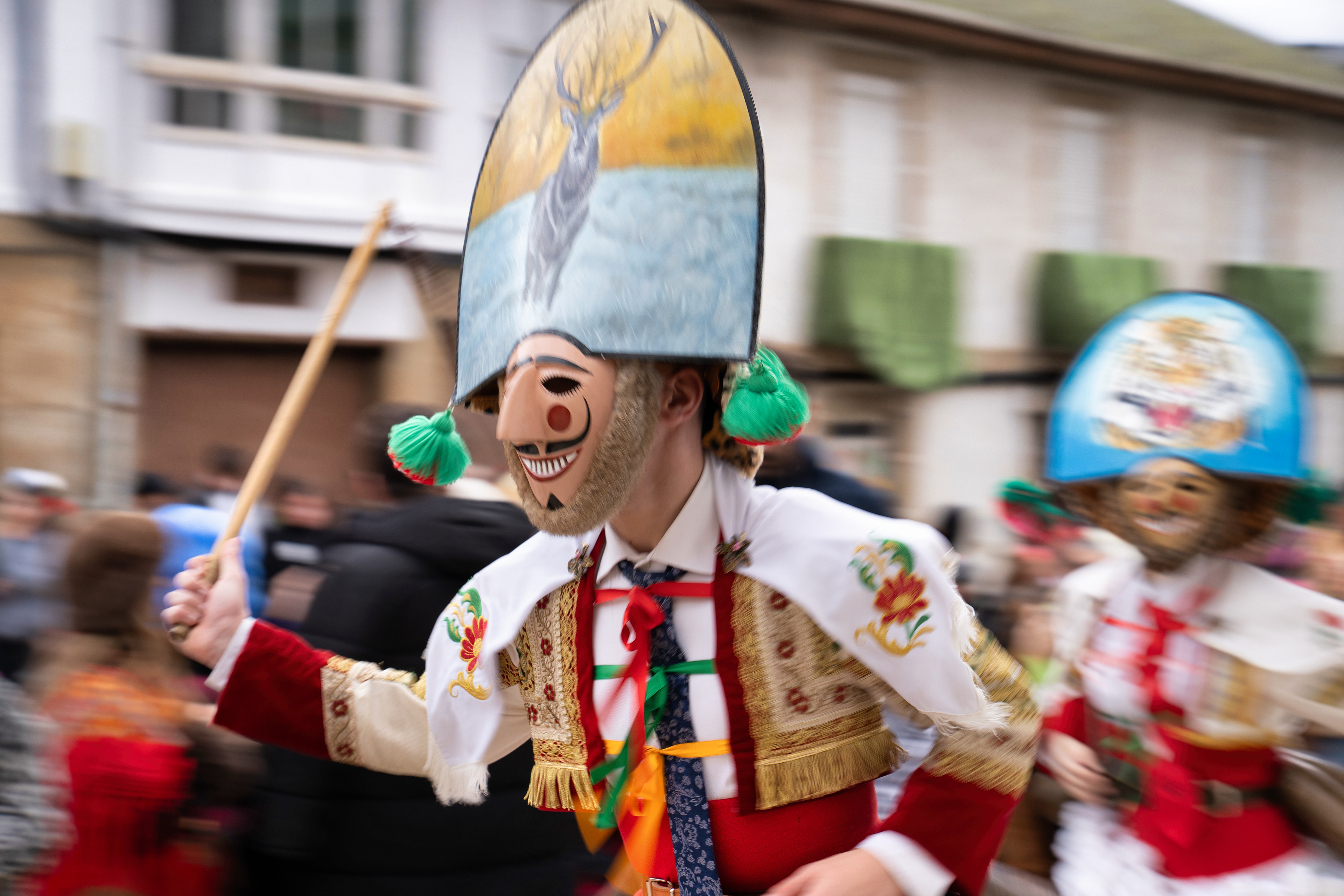 Los Felos de Maceda Aunque a menudo se confunden con los Peliqueiros de Laza o los Cigarróns de Verín, los Felos de Maceda tienen una identidad propia y un carácter distintivo: La Vestimenta: Lucen una careta de madera tallada con una sonrisa burlona y una mitra de cartón decorada con motivos de la fauna local (habitualmente aves o lobos). Visten camisas blancas, corbata, una chaqueta corta con flecos y medias de lana negra. El Sonido: Lo más característico son las chocas (encerros) colgadas de un cinturón de cuero, que anuncian su llegada con un estruendo rítmico mientras corren o saltan. El Comportamiento: El Felo es una figura de autoridad absoluta. Tiene permiso para asustar, saltar sobre la gente y usar su látigo (zamarra), pero no se le puede tocar. Su origen se asocia a antiguos recaudadores de impuestos o vigilantes, mezclado con ritos de fertilidad. Diferenciación: A diferencia de sus "primos" de otras villas, los Felos suelen recorrer las aldeas de la sierra, manteniendo un espíritu más rural, salvaje y errante.